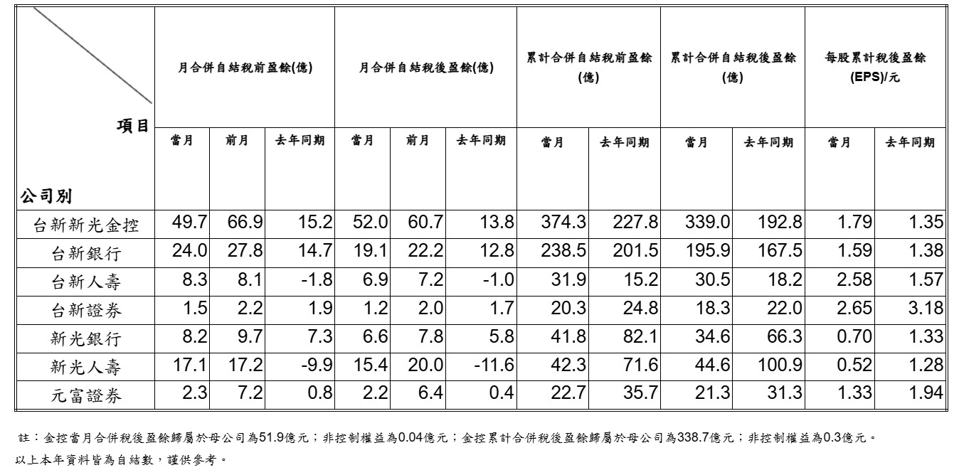 最後公布獲利的台新新光金控,11月自結稅後淨利約52億元,累積前11月稅後淨利及每股稅後淨利(EPS)分別為339億及1.79元。