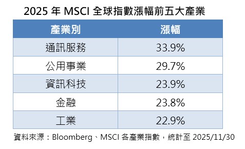 法人檢視MSCI各產業指數今年前11月表現,通訊服務、公用事業漲勢最強,漲幅分別達33.9%與29.7%,緊追在後的是資訊科技、金融、工業,漲幅至少22.9%起跳。