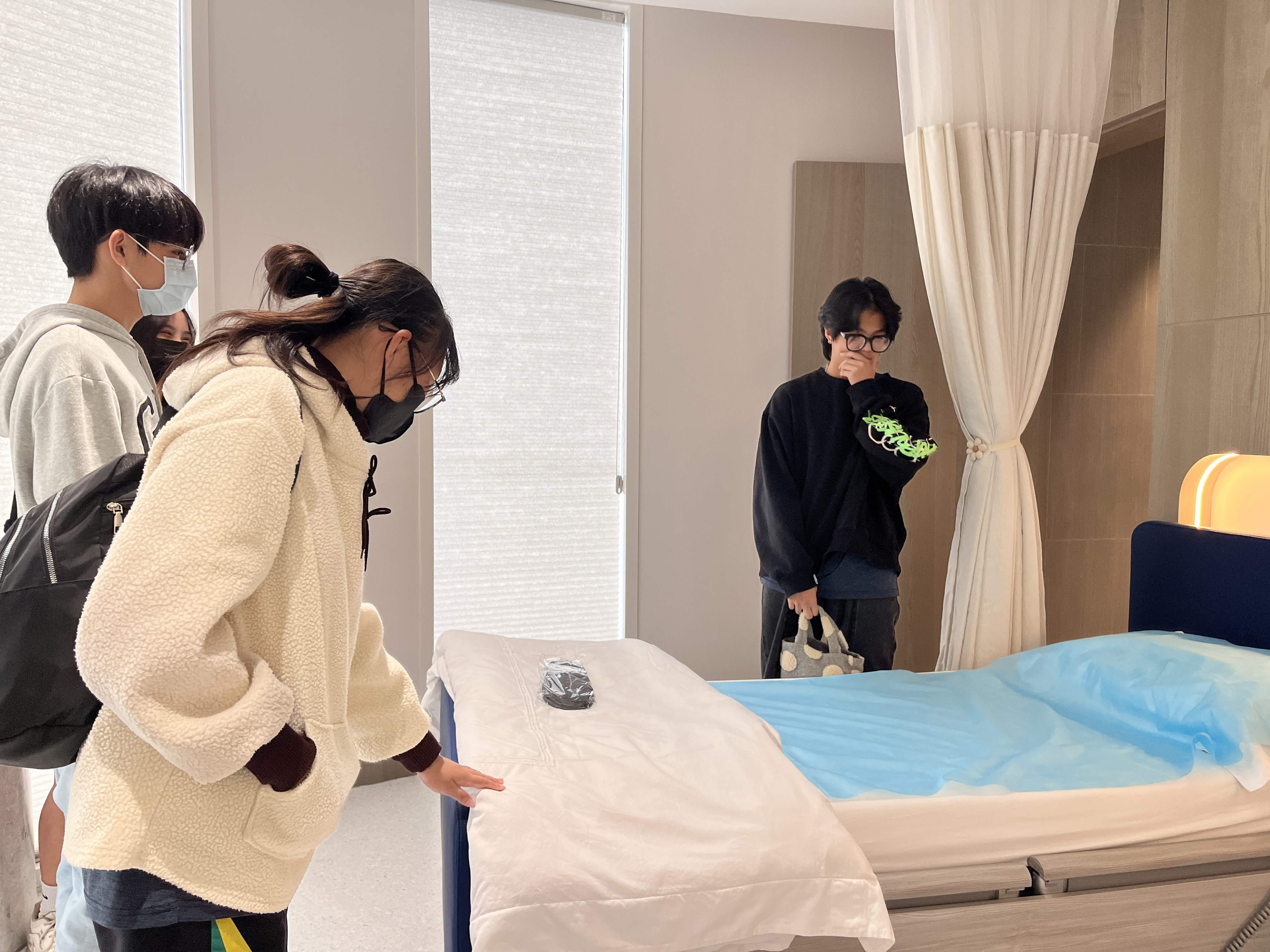 ↑圖說:學員仔細觀察病房配置、床位尺度、照護動線、隱私遮蔽與照度分布等細部,以了解醫療空間如何透過設計回應病患需求。(圖片來源:高雄市青年局提供)
