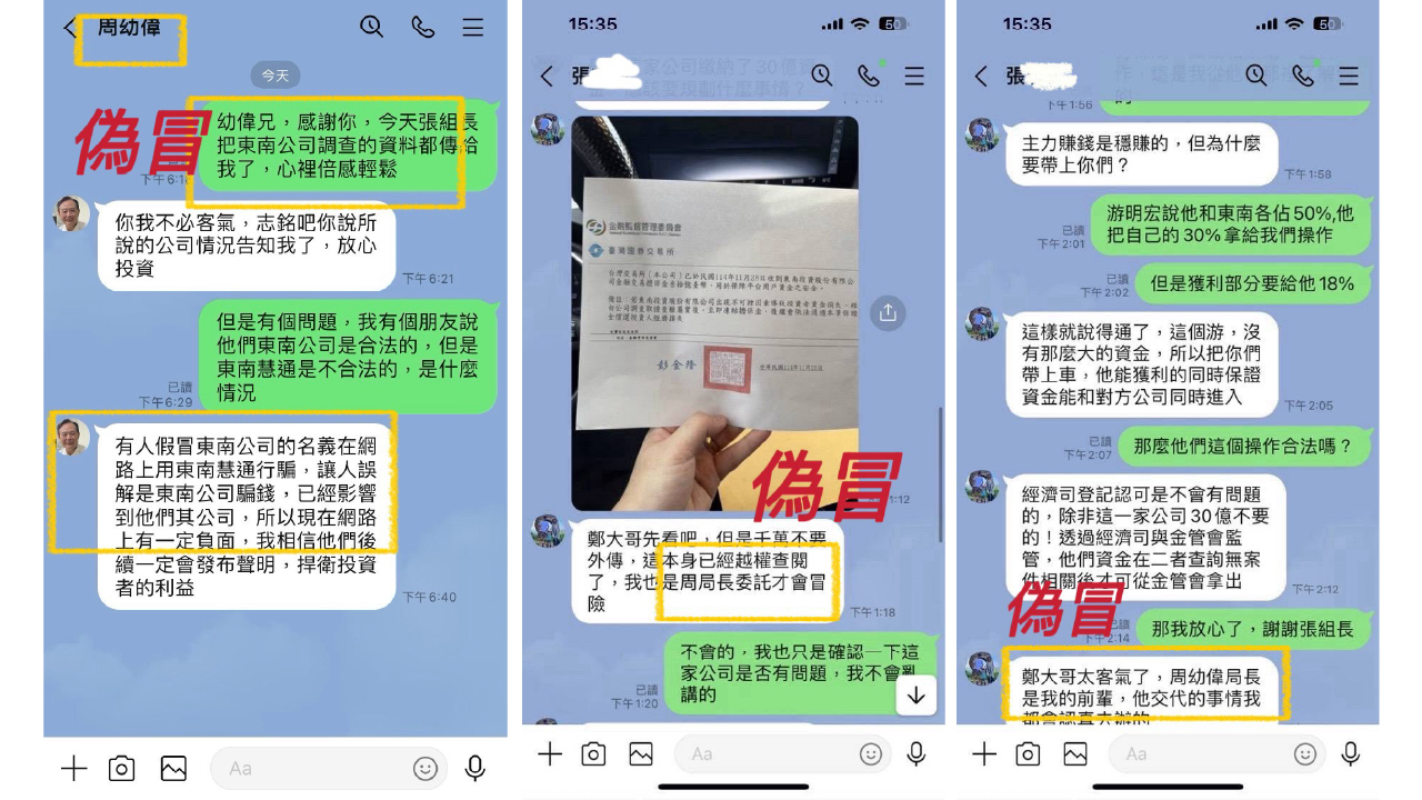 陳姓工程師今年 10 月間於網路上加入不明 LINE 投資群組,該群組成員在這兩個月內,頻繁張貼投資獲利之文字及照片,以營造穩定獲利之假象,陳姓工程師禁不住誘惑,也跟風下載「東南慧通」投資 APP,並依投資群組內的顧問指示操作,而詐團顧問 12 月初誆稱陳工程師抽中「上市增資」股票,要求陳工程師匯款新臺幣300 萬元,陳工程師提出質疑「東南慧通」公司是否為合法投資公司,詐騙集團為了取信民眾,自稱「與刑事局周幼偉局長私交甚篤」,謊稱已拜託周局長指派高雄的刑事組長「張志銘」查證屬實,並傳送偽冒與周局長在局長室會面的 AI 換臉照片,以取信民眾;更甚之謊稱「東南慧通」已繳納 30 億元給「金融監督管理委員會」作為保證金,出示偽造之相關文件,企圖以金管會及刑事局局長的優質專業形象,使民眾誤信後陷於錯誤、匯款投資。