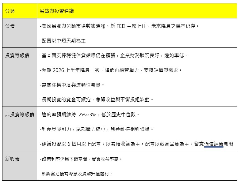 瀚亞投信固定收益部主管周曉蘭指出,美國通膨與就業市場數據溫和,新任聯準會主席將於 2026 年上任,未來降息機率仍存。市場預期美國與歐洲央行在 2026年上半年各降息 2至 3次,有望支撐債券價格。