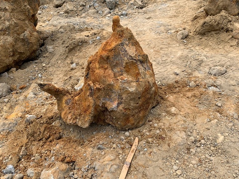 圖說:清代武器鏽塊側拍畫面,外觀呈現不規則塊狀,內含火砲、砲彈及槍管等軍械構件。(圖片來源/台南市政府提供)