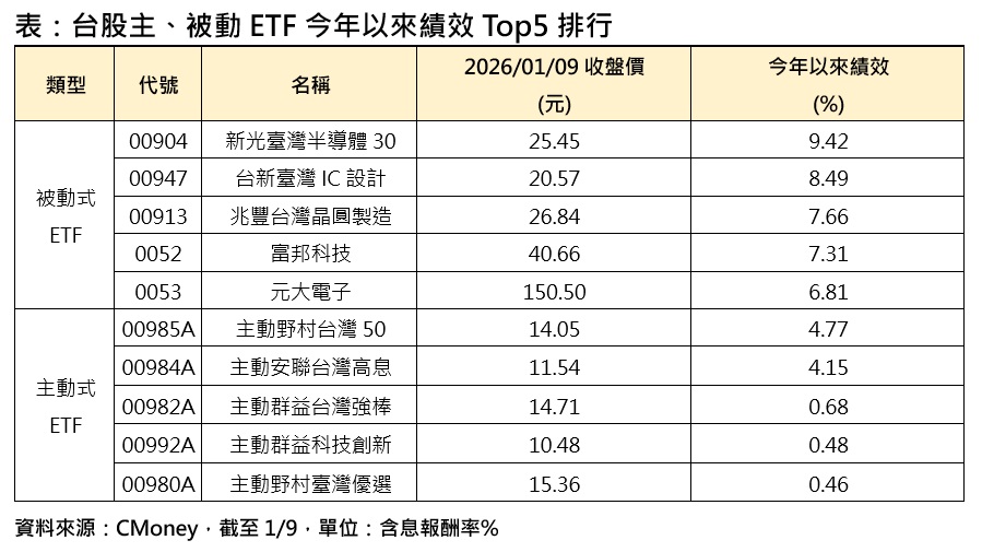如果單看台股ETF,今年以來績效最好的前5檔被動式,績效6.8%起跳,前三名分別是新光臺灣半導體30(00904)、台新臺灣IC設計(00947)、兆豐台灣晶圓製造(00913),全都是半導體相關ETF。