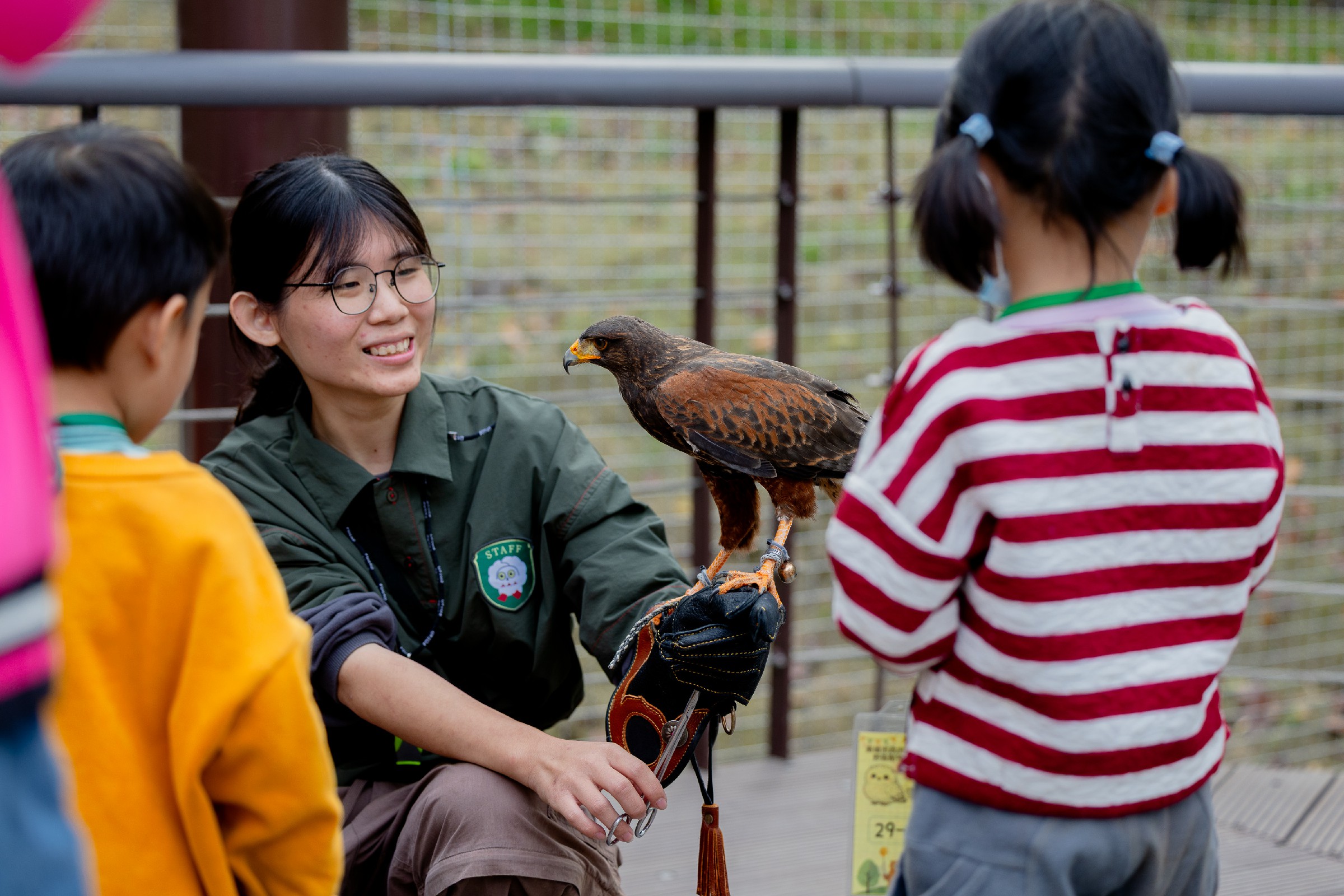 ↑圖說: 飼育員向小朋友介紹哈里斯鷹。(圖片來源:高雄市觀光局提供)