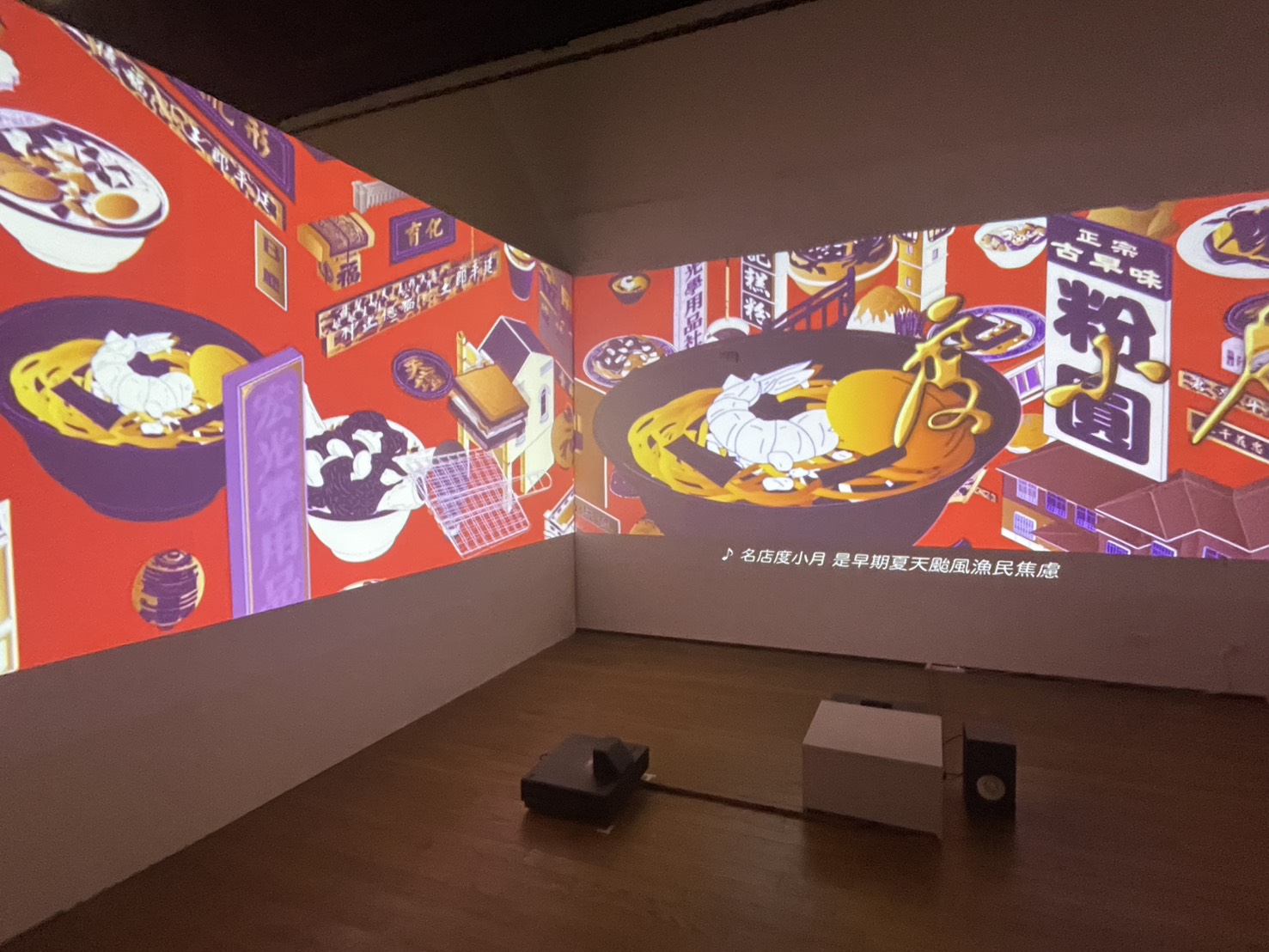 圖說:沉浸式多媒體展區以動畫與音樂呈現台南廟口文化與飲食意象,讓觀眾走入信仰與美食交織的城市日常。(圖片來源/記者林薇安攝)