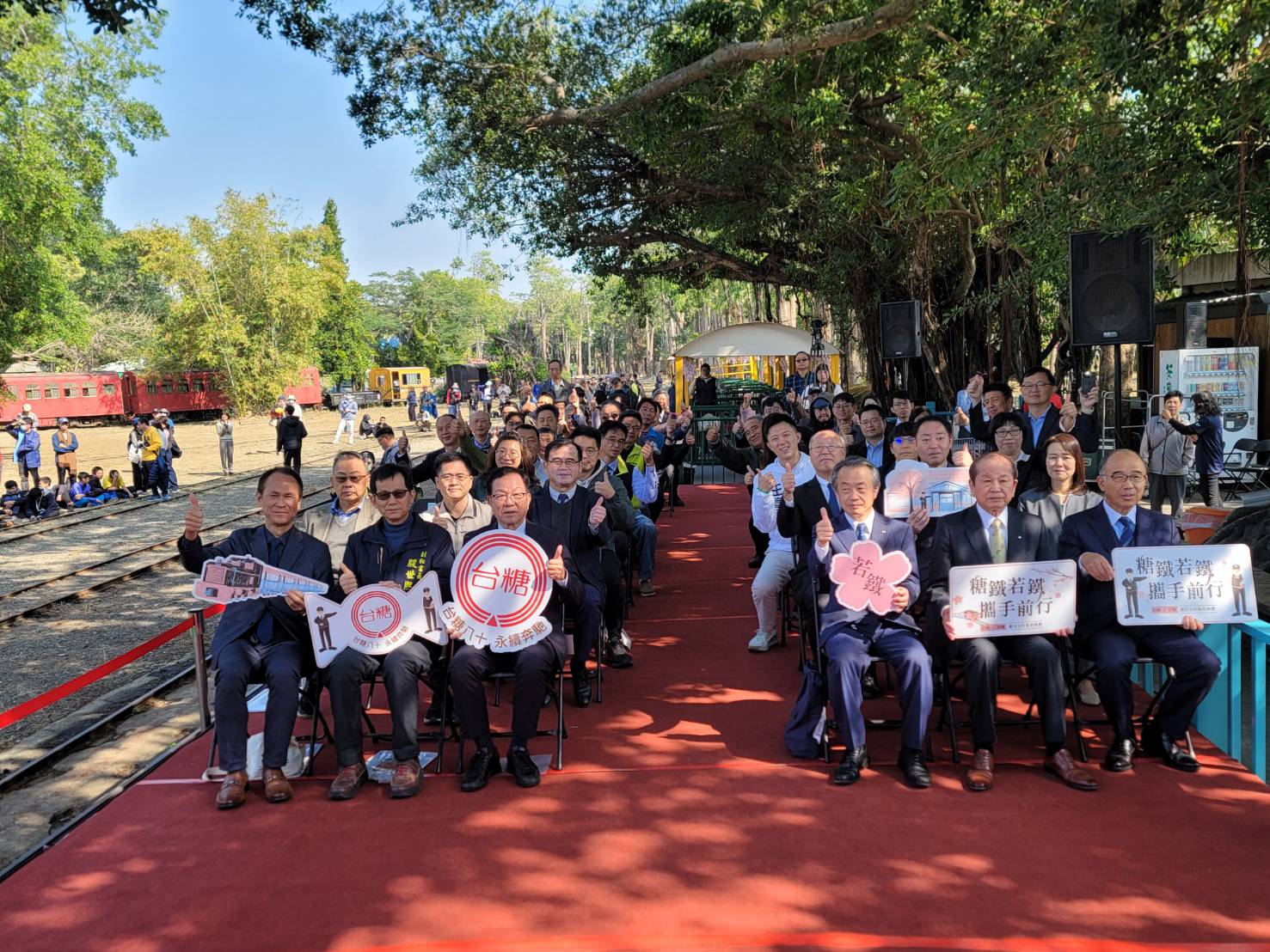 為見證這項跨國合作的重要時刻,台糖特別安排曾於電影《大濛》中亮相的370號蒸汽火車頭鳴笛登場,牽引1941年製的109巡道車緩緩前行,並搭配多輛糖鐵機車頭展示,象徵糖鐵歷史的延續,也為台日雙方合作揭開嶄新篇章。