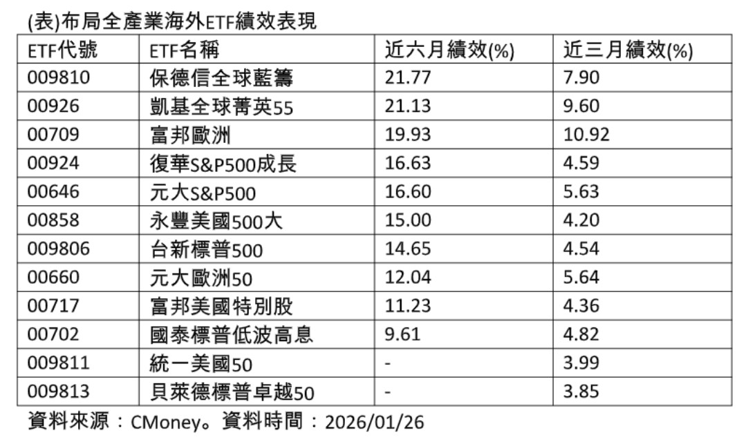 觀察市場布局全產業的海外ETF近半年績效,前三名分別為保德信全球藍籌(009810)、凱基全球菁英55(00926),及富邦歐洲(00709),前兩者含息報酬率雙雙突破兩成。