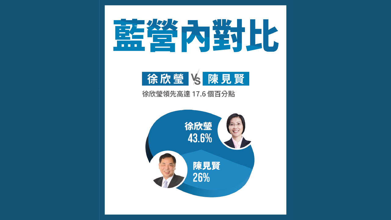 若將焦點回到國民黨內部支持結構,徐欣瑩的優勢更加明顯。民調問及「在徐欣瑩與陳見賢之間,較支持誰代表國民黨參選縣長」時,徐的支持度高達43.6%,大幅領先陳見賢的26.0%,差距達17.6個百分點。政壇人士指出,這樣的差距已非單純「互有消長」,而是呈現明確主流選擇,意味藍營基層與泛藍選民對人選已有相當程度共識。