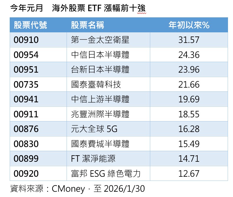 回顧元月,全球股市熱鬧上揚,CMoney統計,元月份海外股票型ETF前十強全部由科技、主題型ETF包辦,其中,第一金太空衛星ETF(00910)漲幅高達31.57%搶下第一名,其後依序為中信日本半導體上漲24.36%、台新日本半導體23.96%、國泰臺韓科技21.66%等。
