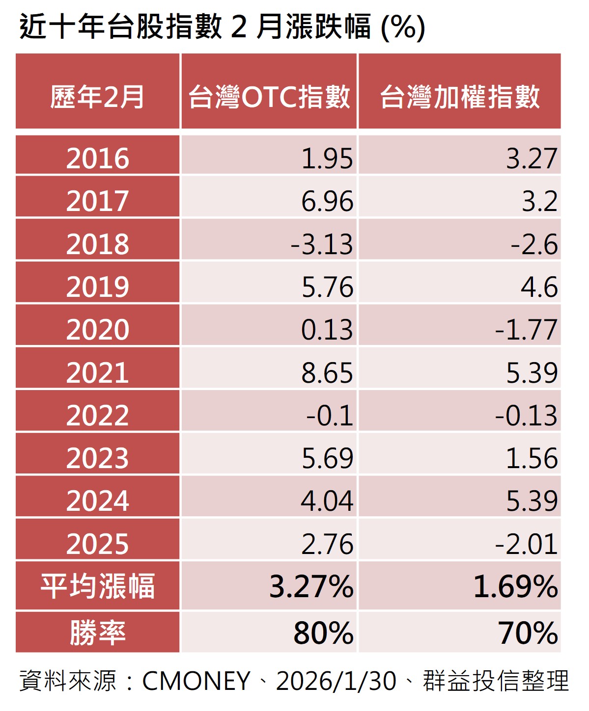 根據群益投信統計資料顯示,近十年來看,歷年2月台股上漲機率約7成,平均上漲1.69%;OTC指數上漲機率更達8成,平均上漲3.27%。