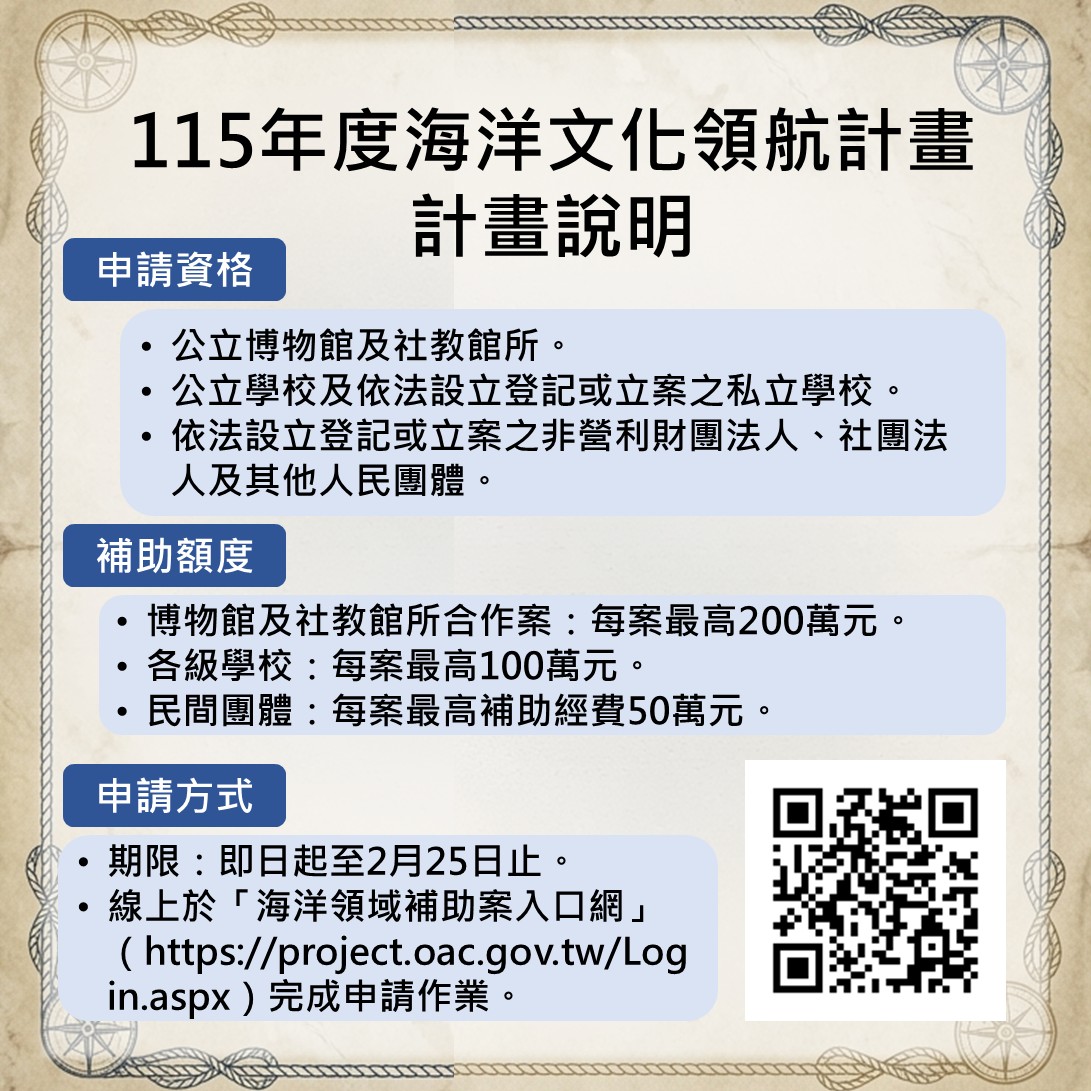 本年度徵件對象為各級學校、民間團體以及公私立博物館與社教館所,申請期限自即日起至115年2月25日止,採線上申請方式,須透過海洋委員會「海洋領域補助案入口網」完成填報並上傳相關文件。補助額度方面,學校單位每案最高補助新臺幣100萬元,民間團體每案最高50萬元,公立博物館及社教館所合作經費每案最高可達200萬元,期望支持不同規模與型態的文化行動共同參與。