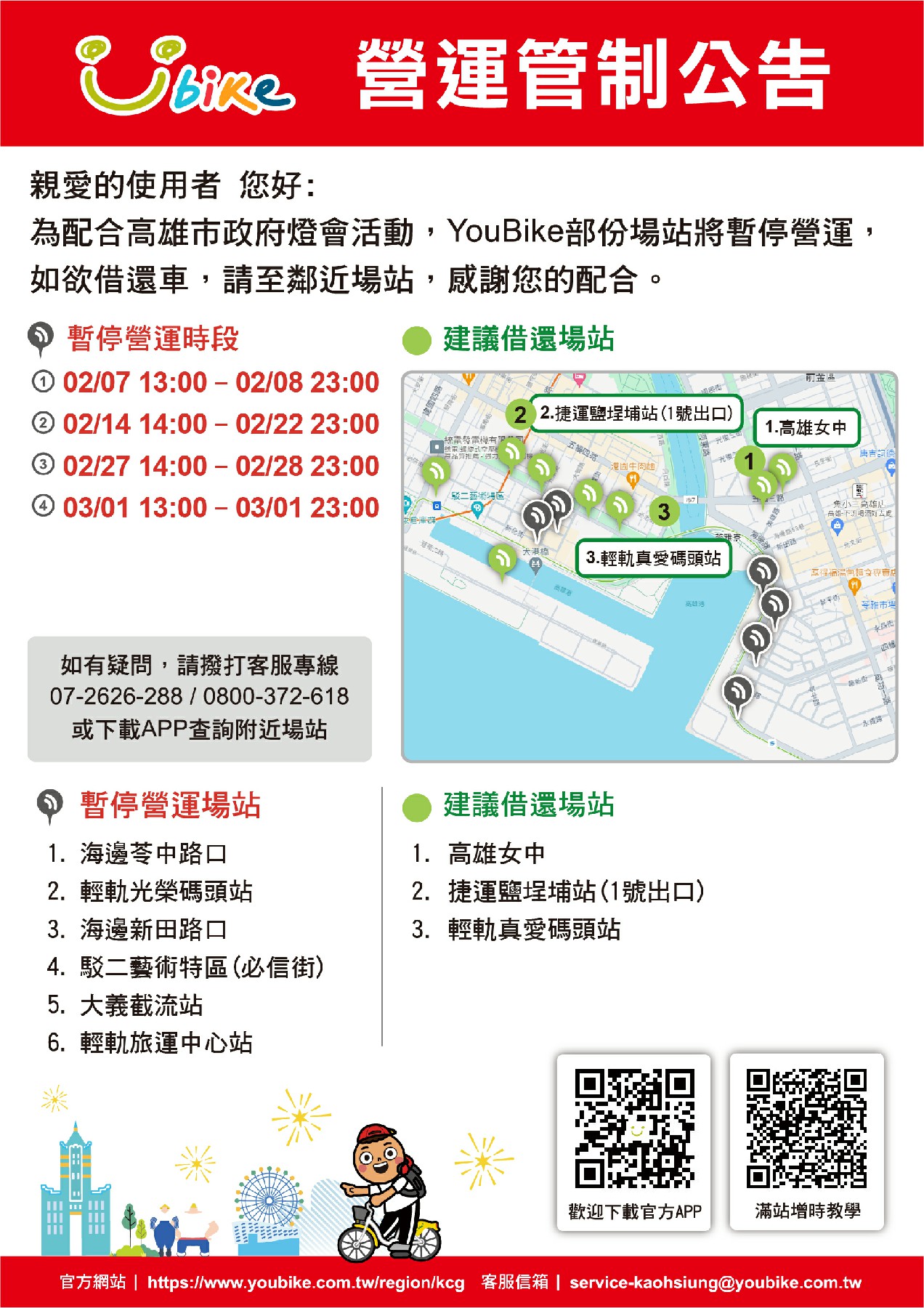 ↑圖說:活動期間,YouBike部分場站將暫停營運。(圖片來源:高雄市交通局提供)