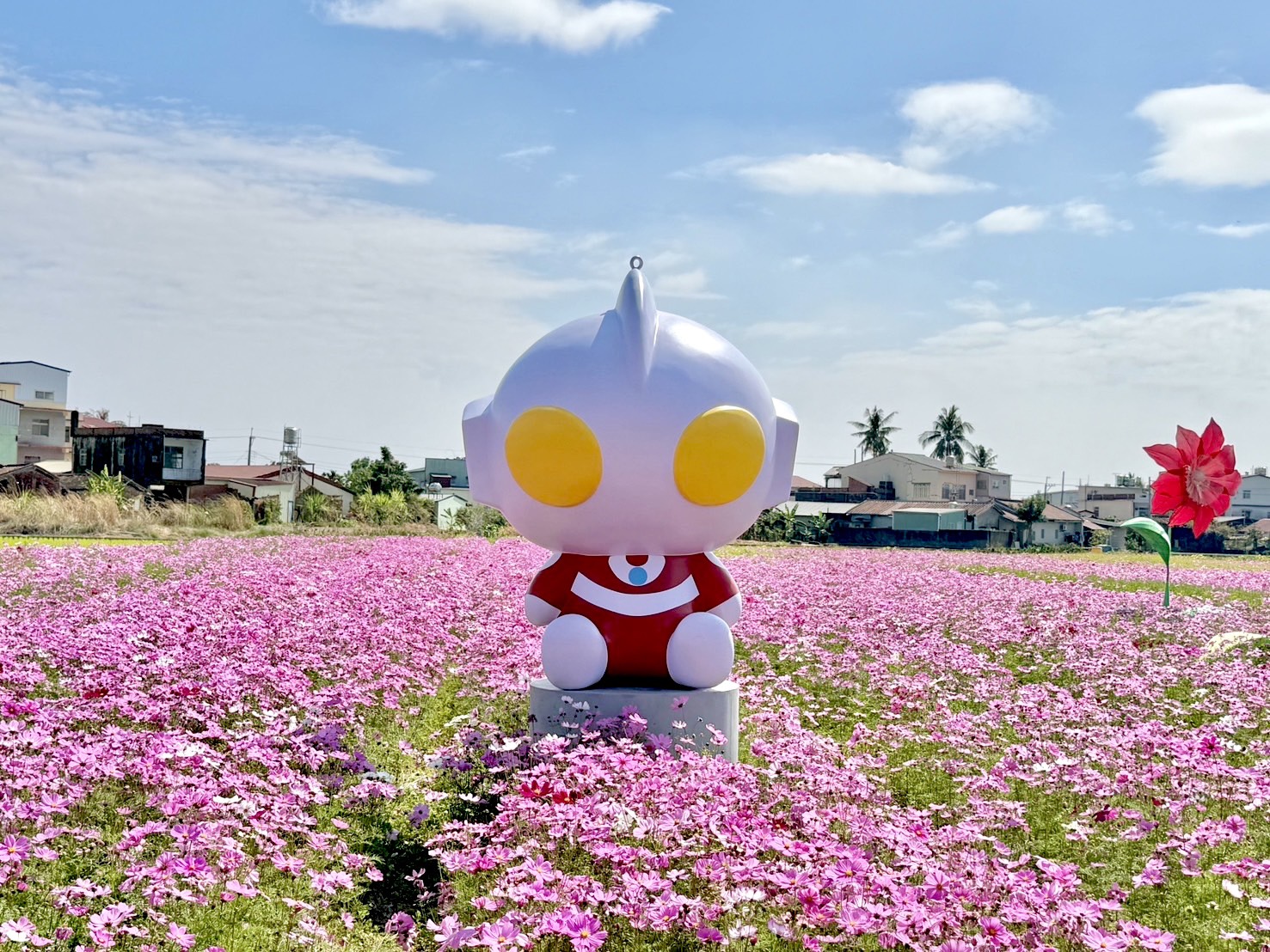 圖說:初代超人力霸王現身於美濃花海。(圖片來源:高雄市觀光局提供)