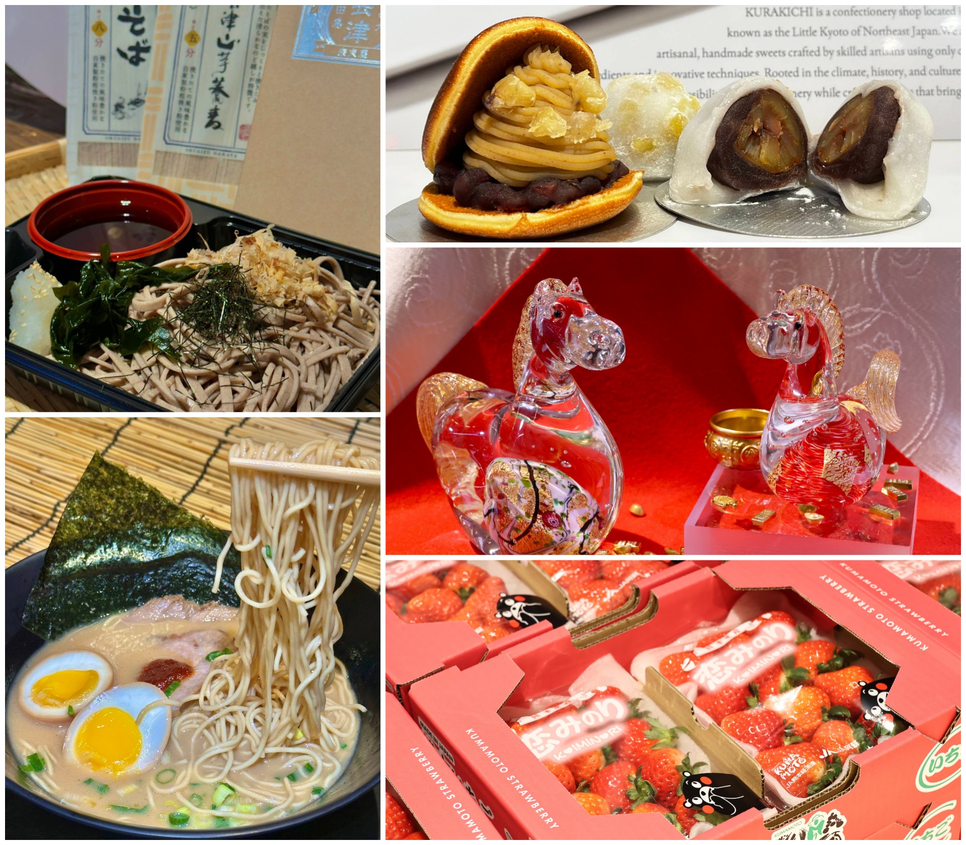 同樣備受矚目的還包括來自秋田角館的「くら吉 KURAKICHI」,主打嚴選食材與現做工藝,帶來蒙布朗銅鑼燒、包入整顆善兵衛栗的大福及精緻和菓子禮盒,兼具視覺與味覺質感;山形縣品牌「上山秀」則以當地品牌米「つや姫」製作泡芙,展現米香與多層次口感。美食版圖亦延伸至鹹食領域,福岡久留米名店「中る拉麵 ATARU RAMEN」首次登台,以濃郁豚骨湯頭揭開暖心新年序曲;北海道直送七星米現碾現煮的「星むすび」豪華飯糰,以及福島奧會津名店「奈良屋蕎麥」以傳統「亂刀切」技法製作的手打蕎麥麵,也讓民眾在高雄即可品嚐道地日本風味。