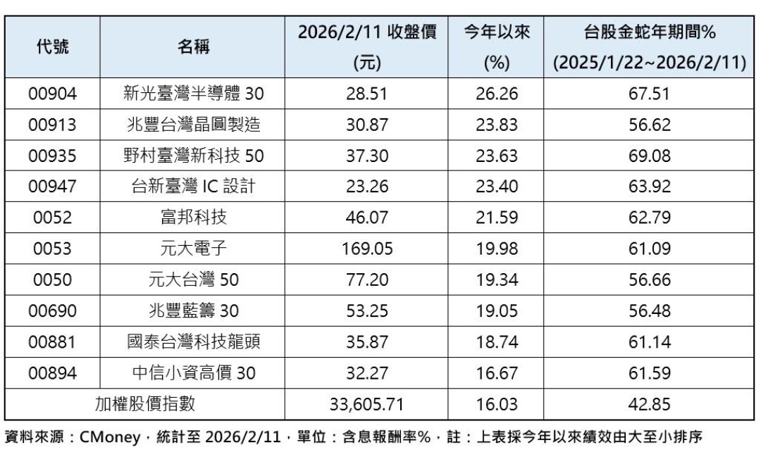 根據CMoney統計,台股在金蛇年期間(2025/1/22~2026/2/11),台積電大漲71.48%,帶動高含積量台股ETF股價成長跟著吃香喝辣,共計有野村臺灣新科技50(00935)、新光臺灣半導體30(00904)、台新臺灣IC設計(00947)、富邦科技(0052)、中信小資高價30(00894)、國泰台灣科技龍頭(00881)以及元大電子(0053)等7檔,績效大漲逾6成超越大盤表現;至於市值型ETF龍頭元大台灣50(0050),也有56.66%的好表現。