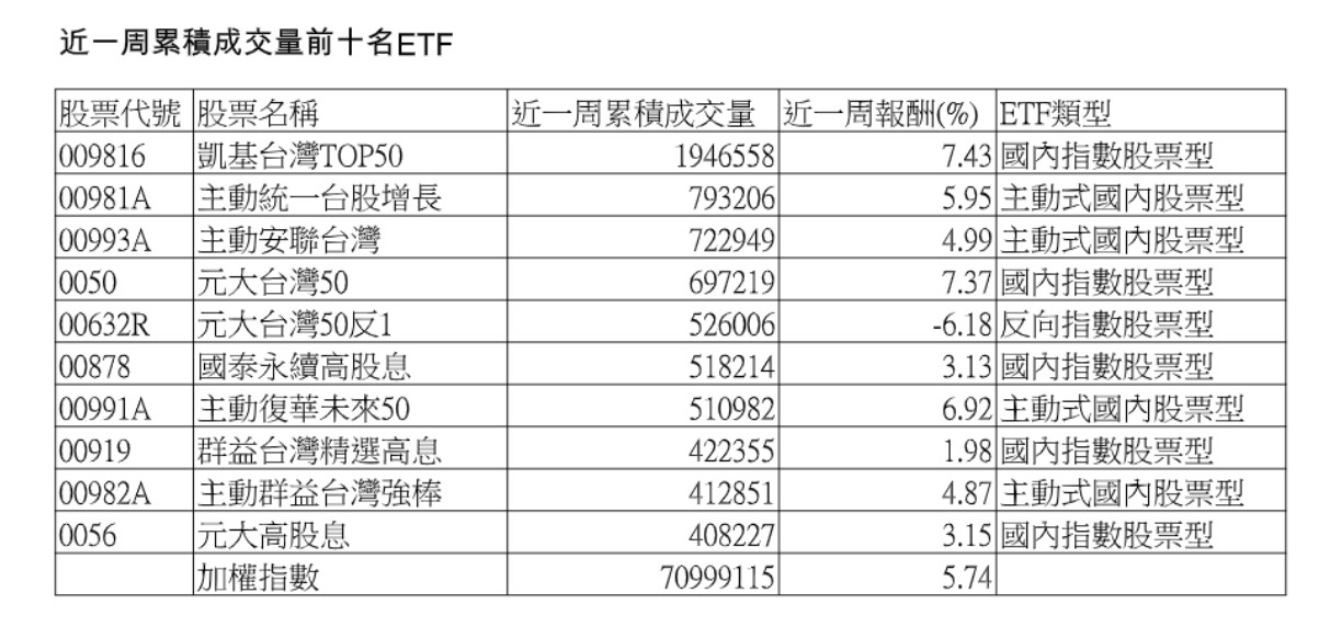短線來看,近一周熱門成交ETF 前10名,有5檔是被動式股票型ETF,4檔主動式股票型ETF,以及1檔反向ETF,其中,凱基台灣TOP50(009816) 7個交易日成交量天天居冠、累積成交量拔得頭籌,近一周報酬也在人氣榜中拿下績效王。