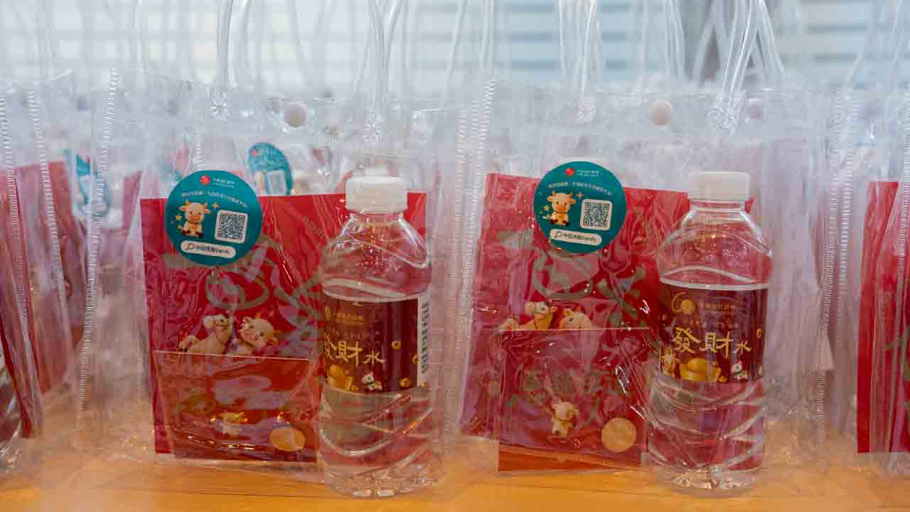 中國信託證券表示,「開運財氣袋」內含「馬上發財水」、「亮點金錢母」及「好運來春聯」,三樣開運小物結合傳統習俗與現代投資理財意涵(如下圖,中國信託證券提供),每處限量供應100組,每人限領一份。