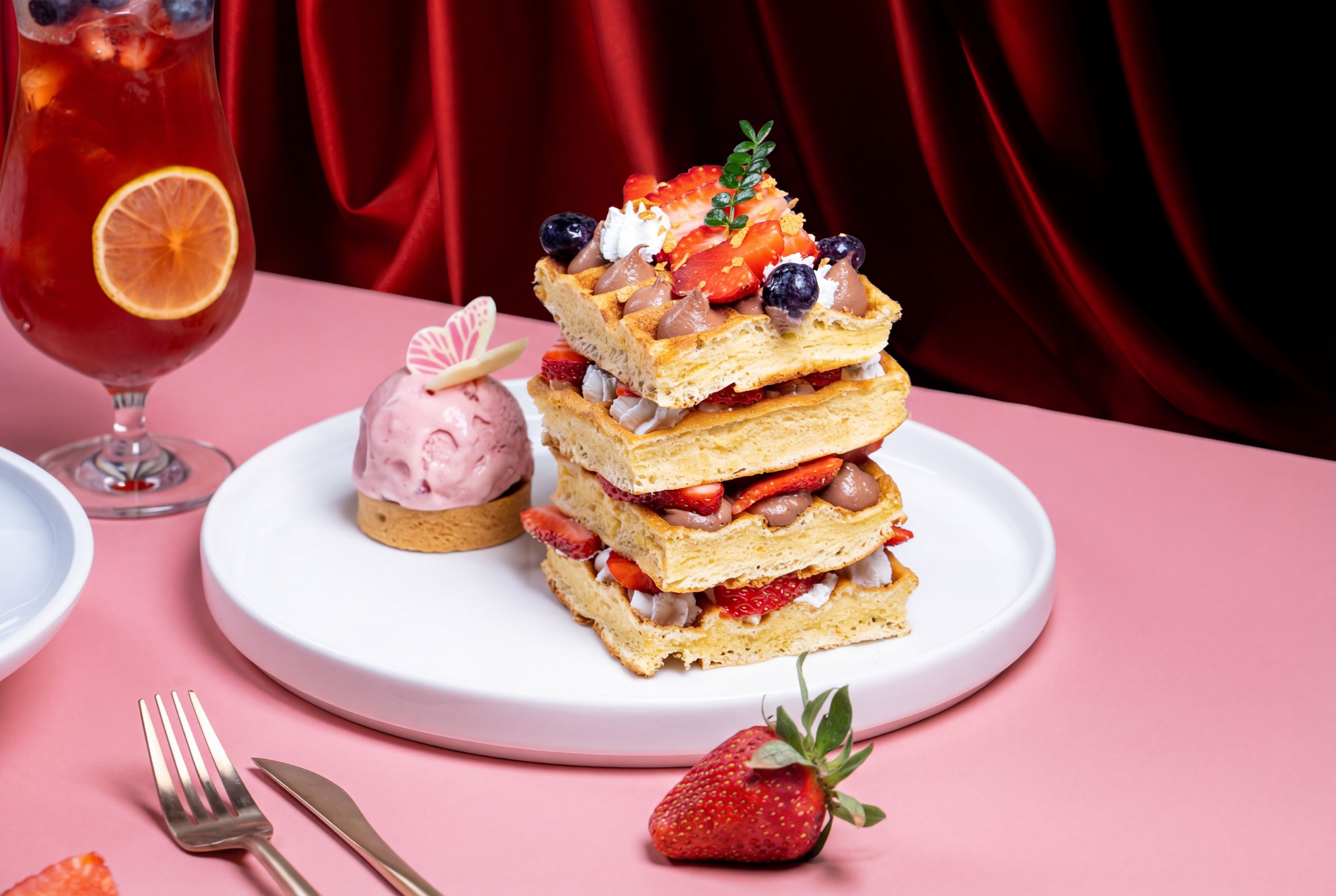 位於11樓的京心咖啡廳以「莓好派對」為題,將草莓融入沙拉、鬆餅與飲品設計。「清新草莓布拉塔花園沙拉」選用多汁鮮莓搭配柔滑布拉塔起司,佐以清爽油醋,乳香與果酸交織出輕盈層次;季節限定的「莓好鬆餅」外酥內軟,鋪上新鮮草莓與細緻奶霜,溫熱餅體與冷冽果香形成鮮明對比,甜而不膩。飲品方面,「草莓緋紅冰茶」以茶韻襯托果香,清爽解渴;「草莓抹茶奶蓋」則揉合微苦抹茶與濃郁奶蓋,尾韻浮現草莓柔甜,呈現成熟風味。甜點每日11時30分至17時30分供應,飲品則自11時至23時販售,活動至2月28日止,每日限量推出。
