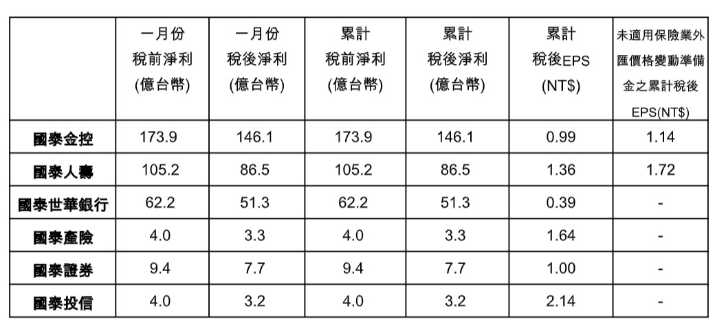 金控2026年1月獲利陸續出爐,其中,國泰金自結1月稅後淨利146.1億元,EPS 0.99元,追平去年同月。旗下子公司國泰世華銀行、國泰證券及國泰投信,單月稅後淨利皆創下同期新高。