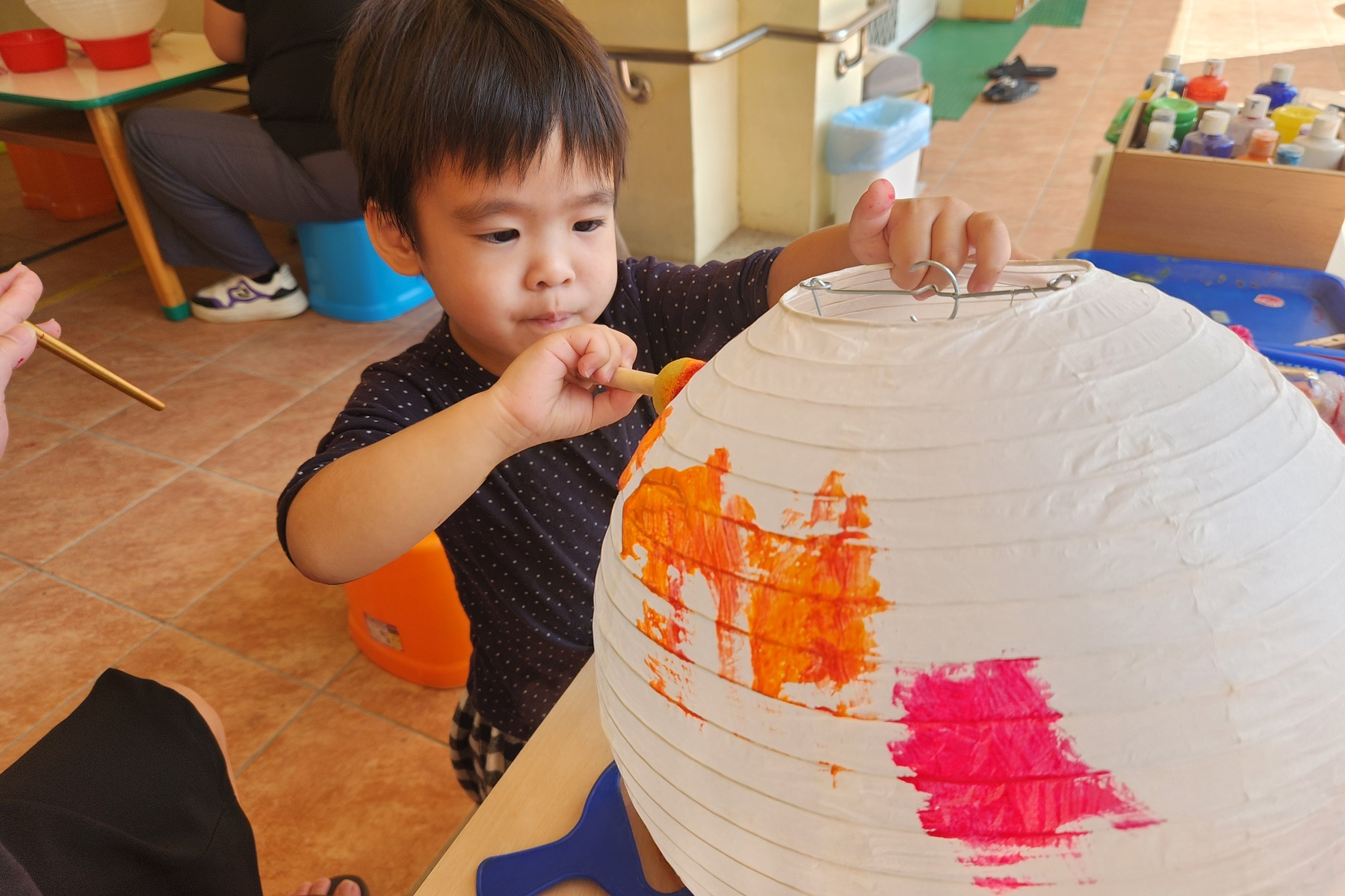 活動一開始,先認識圓圓形狀的燈籠,引導孩子們用筆勾勒輪廓底稿,再用海綿拓印、手指點畫及貼紙裝飾的創作方式彩繪燈籠;活動最後,由家長和孩子一起裝飾LED小燈泡。當燈籠一閃一閃發光,五彩燈光吸引幼童們開心地鼓掌叫好。