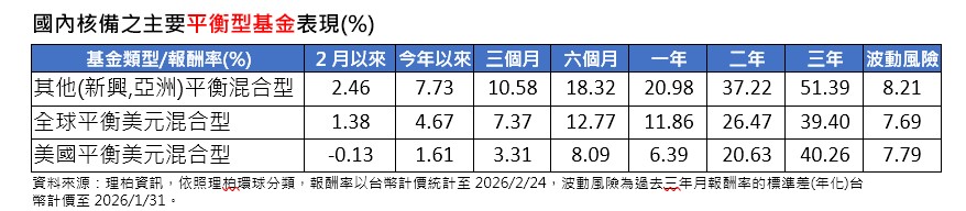 相對地,美國股票型基金受到科技股修正影響,加上川普新關稅、美伊地緣局勢等變數回檔,全月下跌2.06%,表現落後。