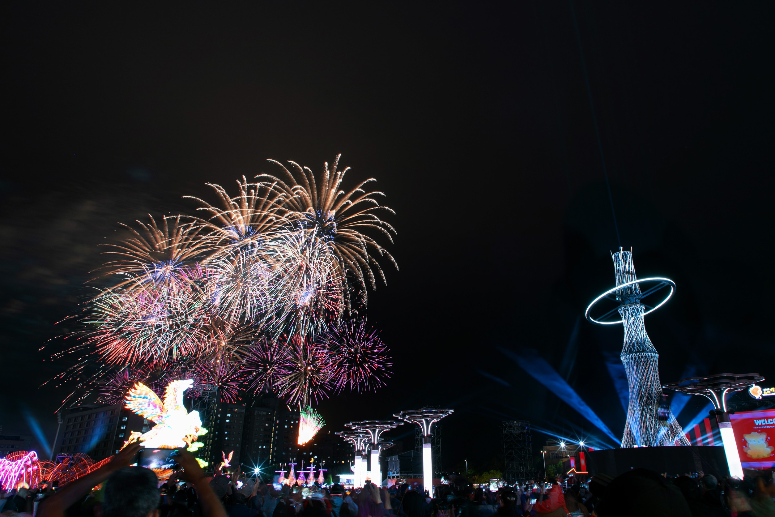 主燈「光沐—世界的阿里山」由藝術家姚仲涵、陳威志與盧彥臣聯手打造,高達21公尺,以阿里山神木、太陽與水霧為核心意象,象徵光、水、木共生循環。隨著主燈秀與長達10分鐘的高空煙火綻放,夜空流光溢彩,掌聲與歡呼聲此起彼落,為為期13天的燈會揭開燦爛序章。