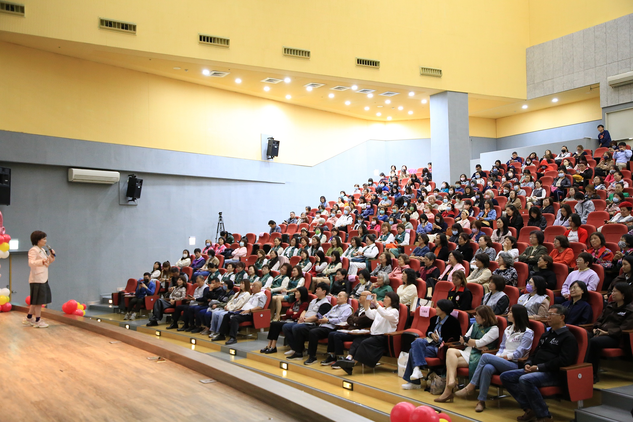 ↑圖說:沈春華以《歲月淘金,為幸福「嘉」分!》為題演講,吸引各界熱情參與。(圖片來源:嘉義市社會處提供)