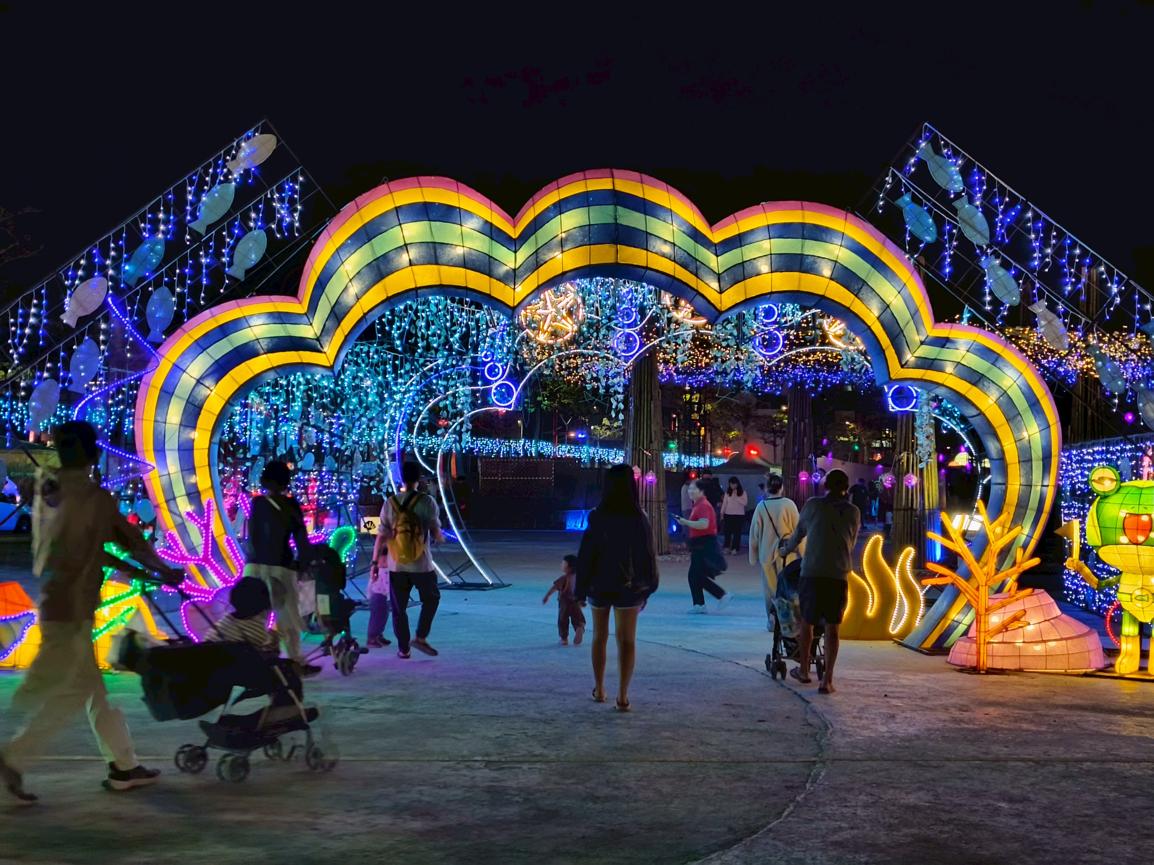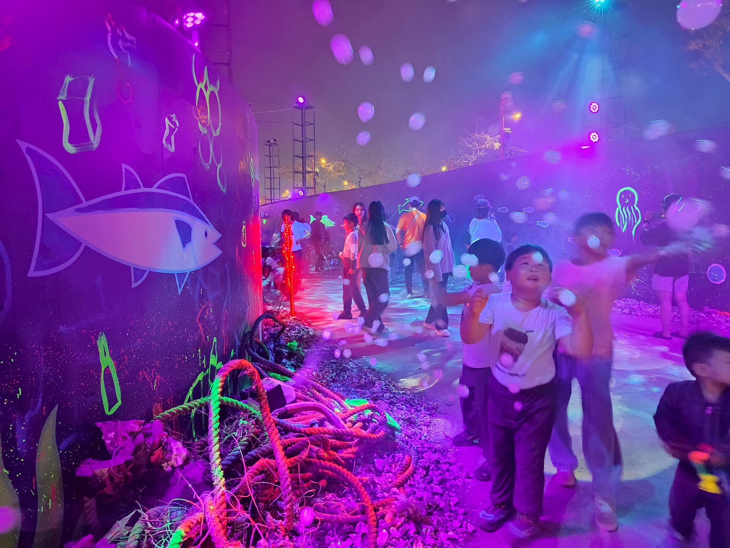 此外,展區打造沉浸式海底場景,繽紛魚群燈飾環繞四周,地面投影彩色小魚穿梭腳下,海底隧道還不定時噴出泡泡,讓孩童興奮不已,彷彿置身真實海洋世界。