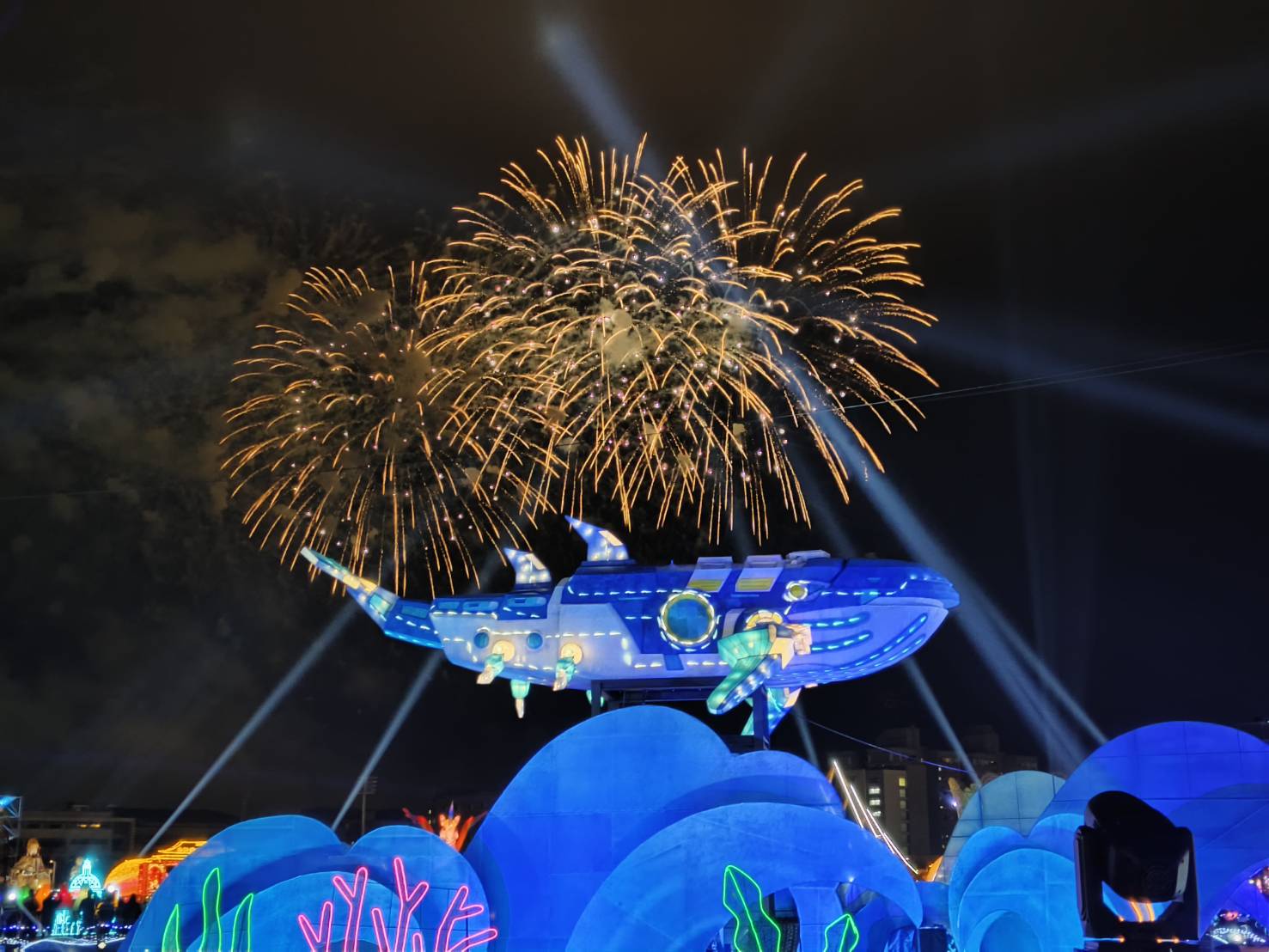 燈區主燈「鯨魚戰艦」象徵智慧、強大與溫柔並存的力量,展演結合燈光與音效科技,每日晚間6時15分至9時45分,每30分鐘上演一場主燈秀,絢麗光彩在夜空中流轉,吸引大批遊客駐足觀賞與拍照,成為社群平台打卡焦點。