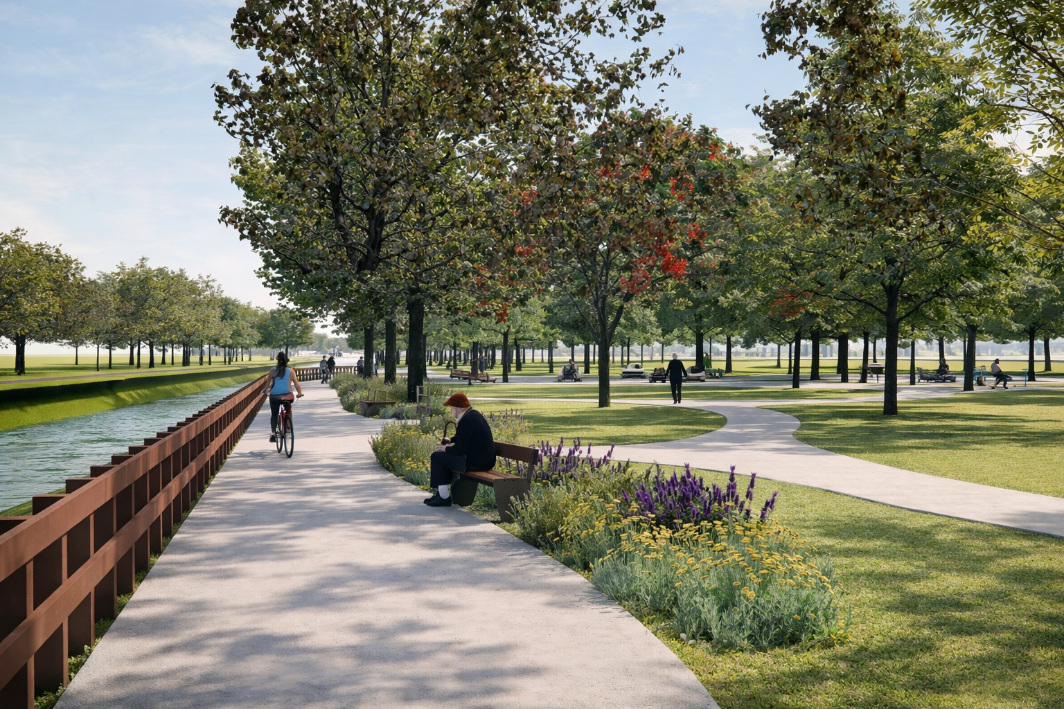 此次改善工程將重新規劃園區動線,打造環狀步道系統,並串聯東側既有散步路線,形成連續且友善的步行空間,提供民眾散步、慢跑及日常運動使用。步道周邊也將搭配灌木與綠化植栽,並結合鄰近水岸景觀,營造舒適宜人的戶外活動環境。