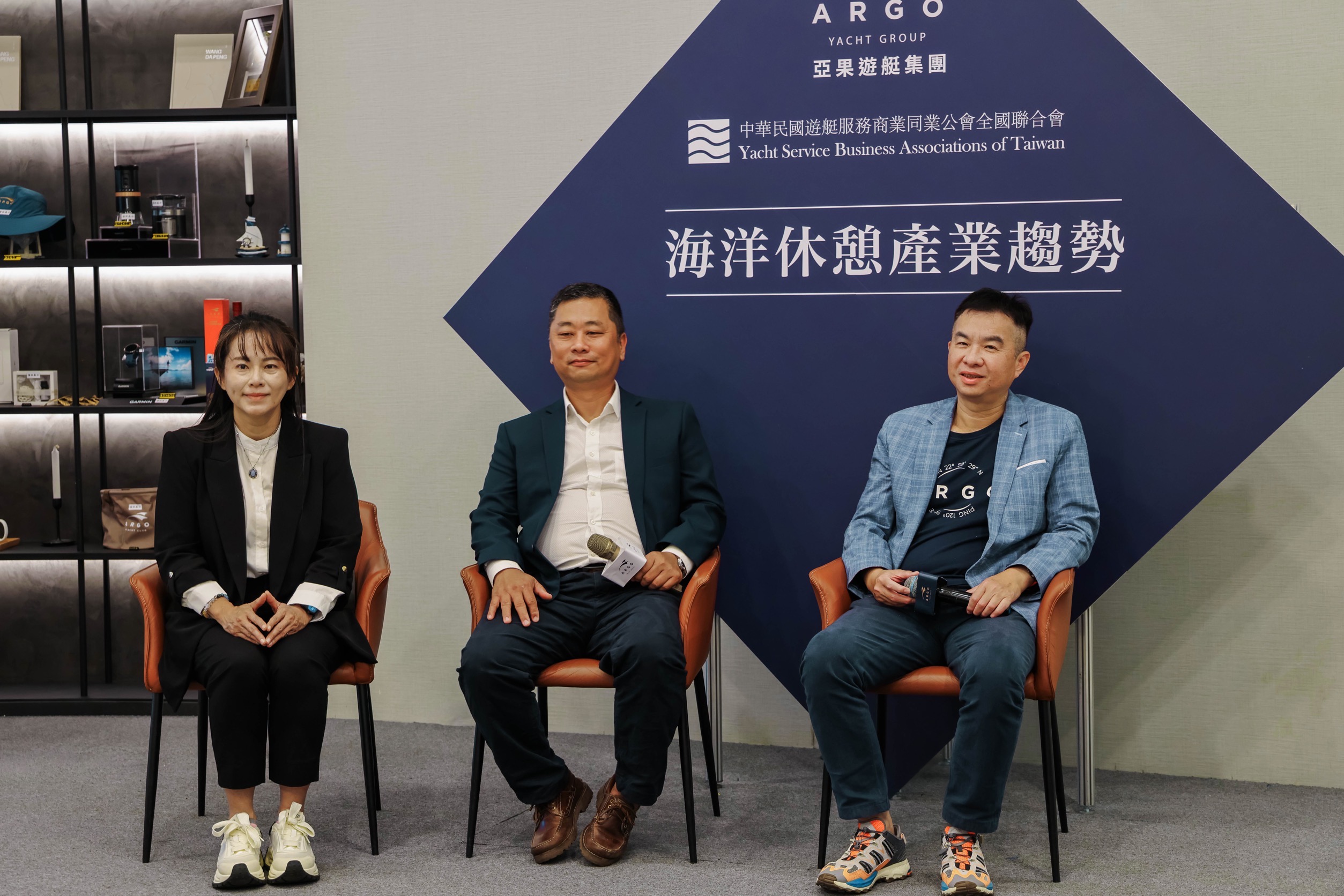 圖說:亞趣行銷股份有限公司陳宛格總經理、高雄市遊艇服務商業同業公會潘泰安理事長、亞果遊艇集團董事長侯佑霖共同主持記者會。(圖片來源:亞果遊艇提供)
