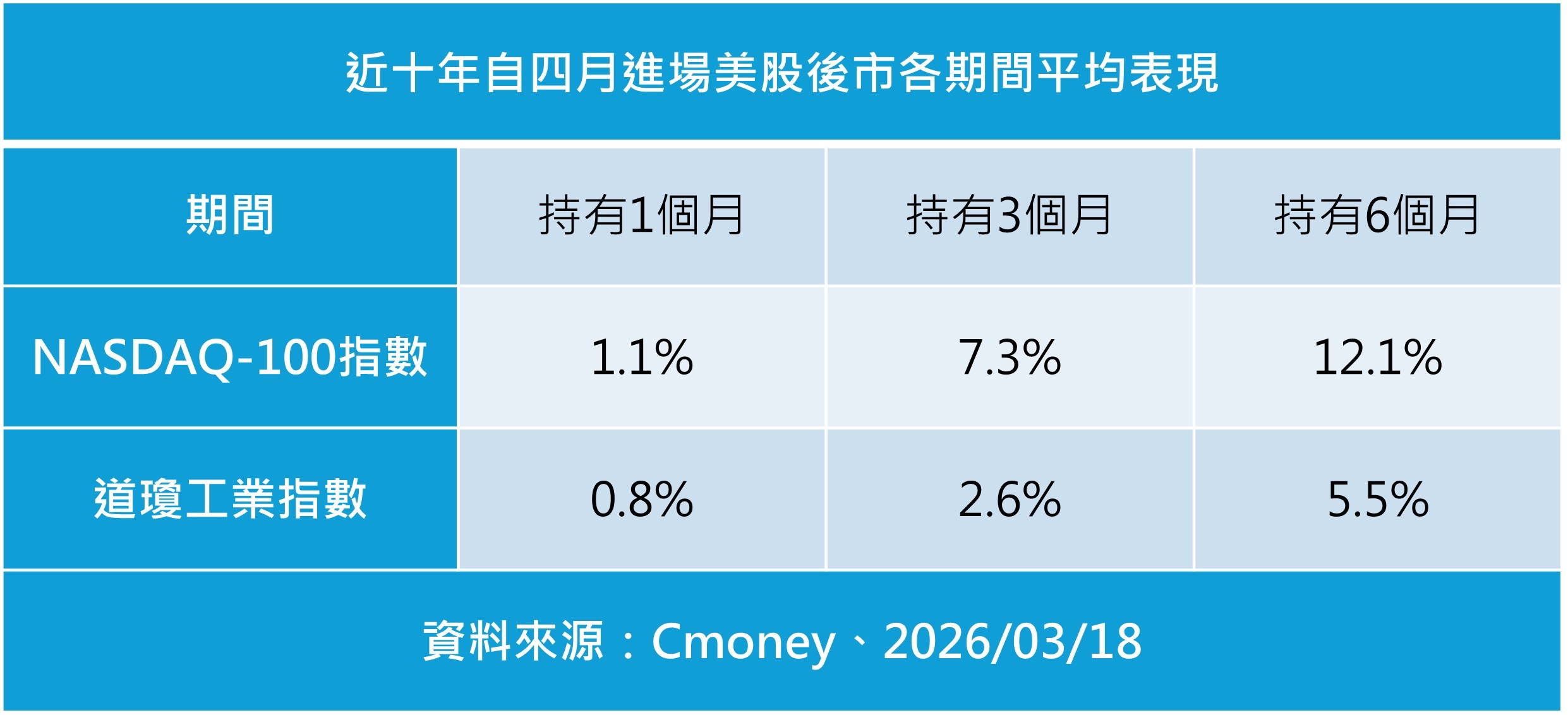 吳承恕進一步指出,理由三為聯準會的政策也多於4月開始清晰,且新任聯準會主席將於Q2就任,降息循環有望延續,亦有助帶動景氣與股市表現。回顧近十年4月進場美股後各期間指數表現,道瓊工業指數後3月、6月平均上漲2.6%與5.5%,而具備獲利與題材加持的成長股表現更為突出,NASDAQ-100指數後3月、6月平均上漲7.3%與12.1%。