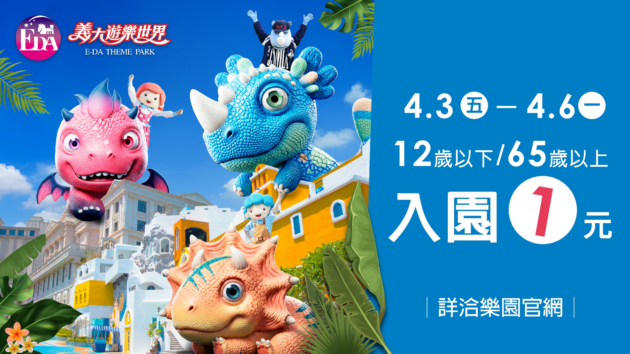 園方表示,4月3日至6日連假期間推出「三代童堂1元玩樂園」方案,民眾只要購買一張1080元全票,即可加購一張1元優惠票,適用對象為12歲以下兒童或65歲以上長者,鼓勵祖孫三代一同出遊,藉由優惠降低家庭旅遊門檻,帶動節慶人潮。