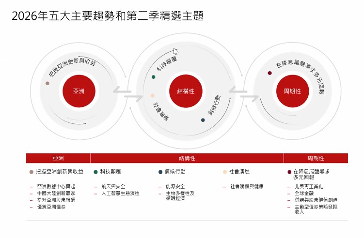 • 啟動收益引擎: 在預期降息次數減少的情況下,以投資級別債券及新興市場債券為核心的收益策略,有助支撐整體回報並提升投資組合韌性。