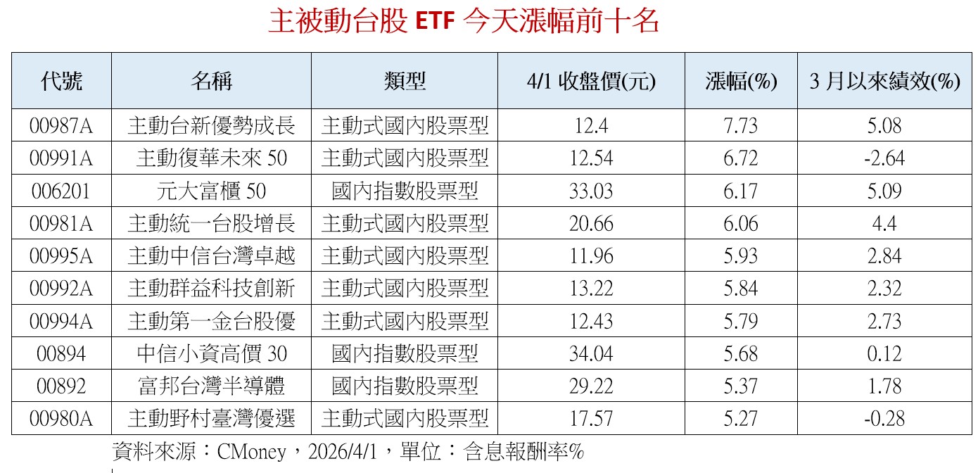 台股ETF也是飆翻天,單日10強皆大漲5%以上,其中,台新臺灣優勢成長主動式ETF(00987A)漲逾7%,高居主被動ETF績效王。