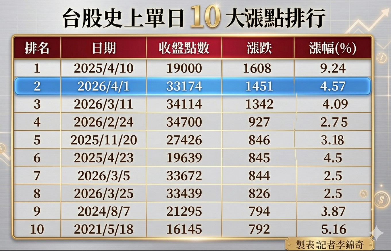 亞股今天也受到激勵,韓股狂漲8.4%,日股大漲5.2%,台股也同樣狂拉,盤中飆漲1459點,收盤仍大漲1451點至33174,改寫台股史上單日第二大收盤漲點記錄。