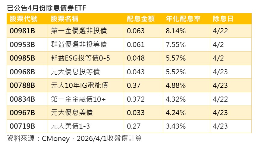 債券ETF四月除息秀相繼登場,除了4檔已率先在4月1日除息,還有多檔月配息及季配息債券ETF將陸續除息, 12檔已公告除息債券ETF中,兩檔非投等債ETF年化配息率最高,包括:第一金優選非投債(00981B)年化配息率達8.14%、群益優選非投等債ETF年化配息率達7.55%。