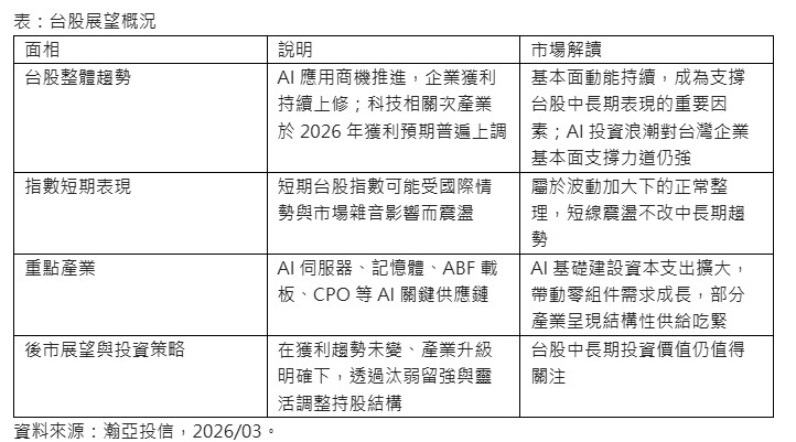 瀚亞投信指出,儘管短期台股指數仍可能受到國際情勢與市場雜音影響而震盪,但從基本面觀察,在外需動能穩健、企業獲利成長趨勢明確,以及產業結構持續升級的支撐下,中長期仍具備結構性投資機會。特別是在 AI相關應用持續擴展的帶動下,台灣科技產業於全球供應鏈的關鍵地位,仍有助支撐整體市場表現。