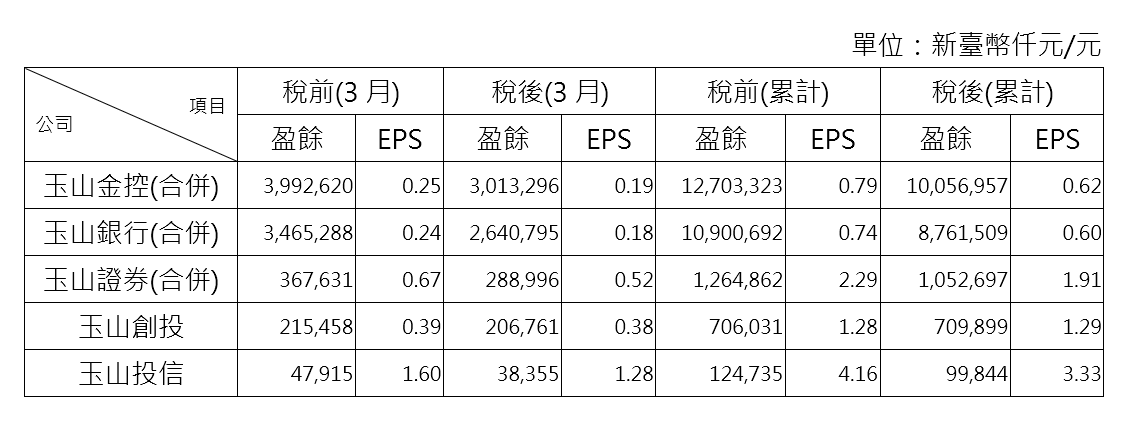 主要子公司玉山銀行首季稅後盈餘87.62億元,年增0.45%;玉山證券10.5億元;玉山創投7.1億元;玉山投信1億元。