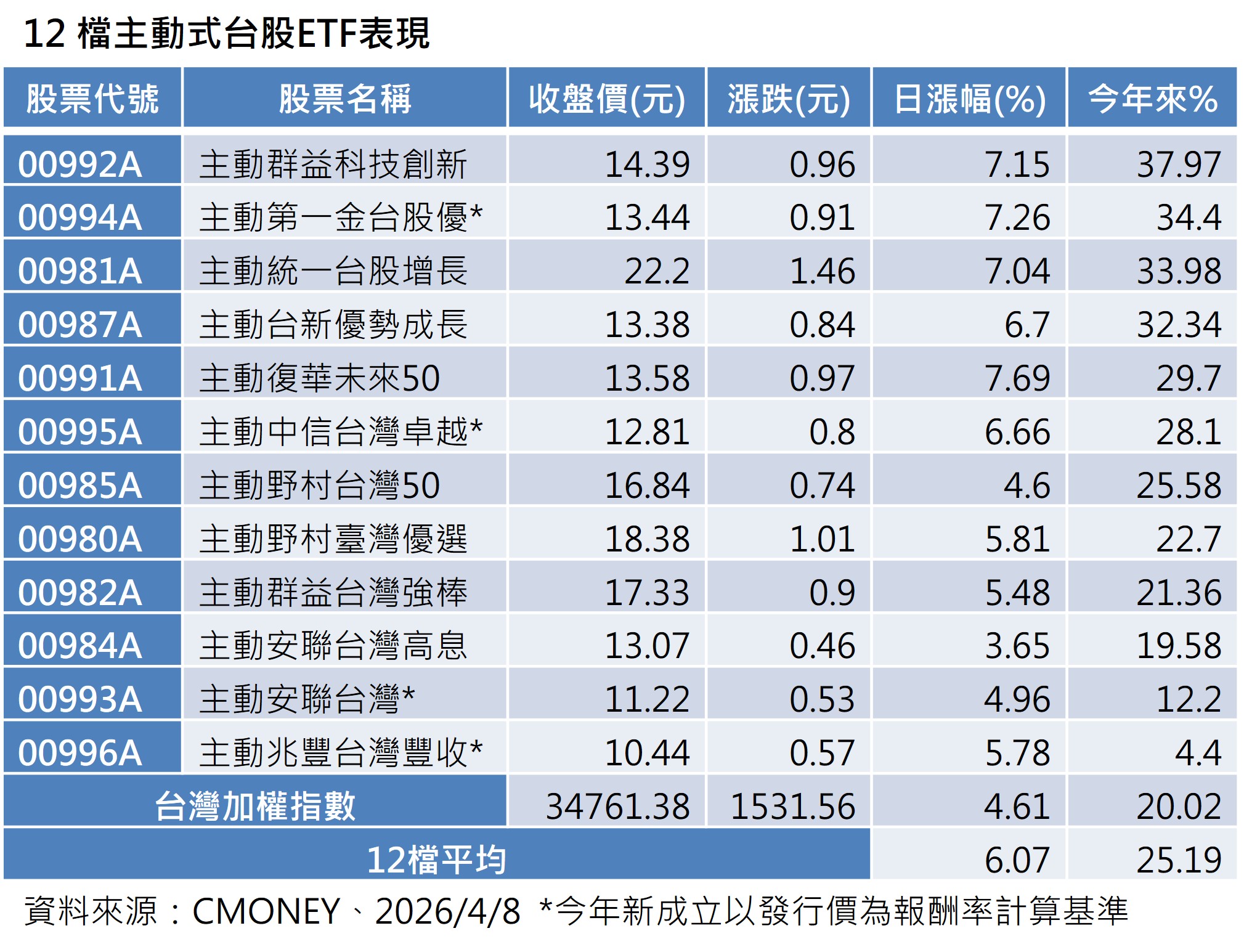 若再比較今年以來,12檔主動式台股ETF平均漲幅25.19%,打敗大盤同期的漲幅20.02%,其中,主動群益科技創新(00992A) 累計漲幅37.97%居冠,贏過大盤將近1倍。