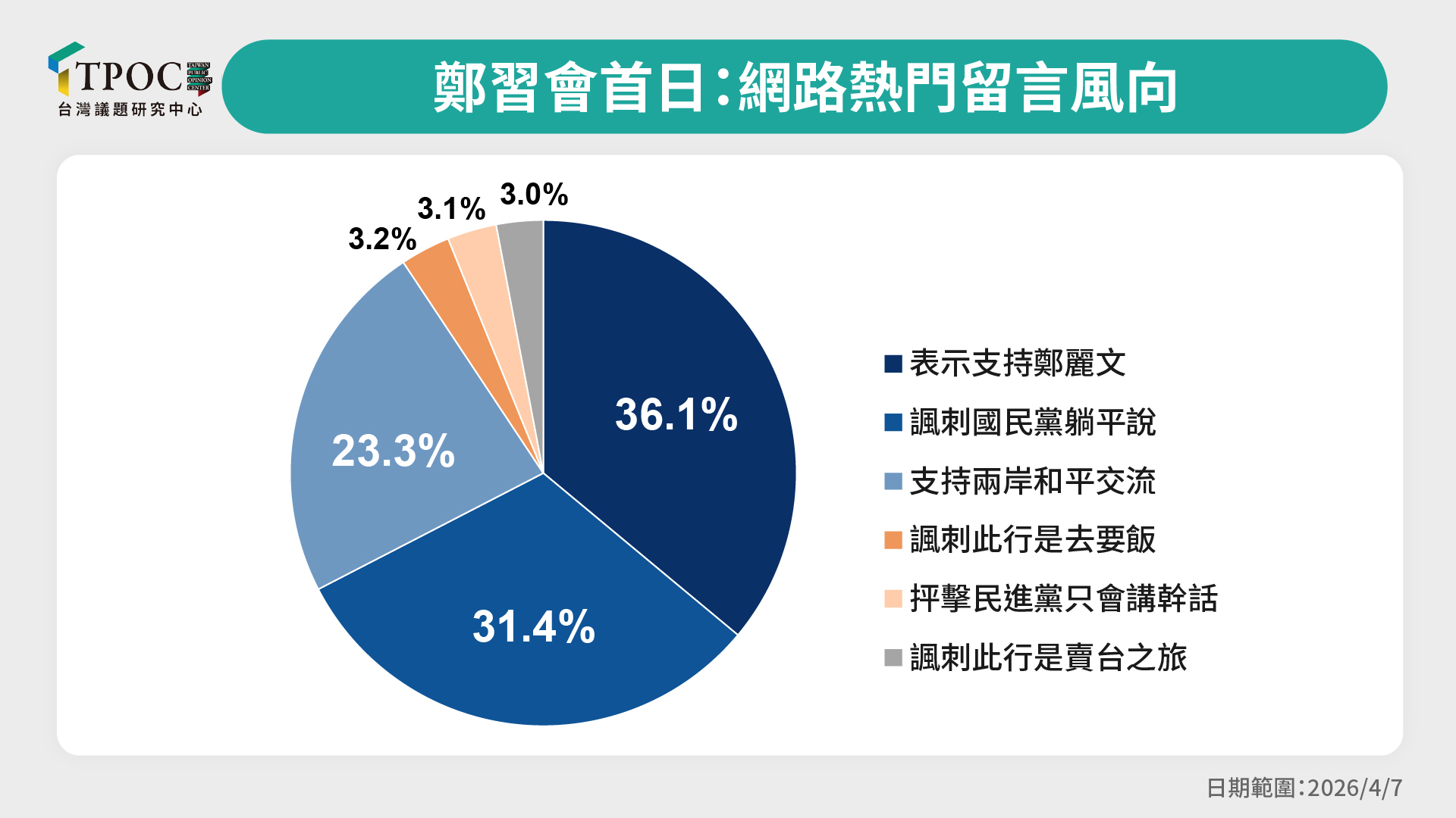 從訪問首日的熱門關鍵字來看,除本次會談主角「鄭麗文」與「習近平」外,「賴清德」亦成為關注焦點。其於7日出席鄭南榕追思會時談及和平議題,表示「和平須沒戰事、保主權」,才稱得上真正的和平,此番言論被外界解讀為對國民黨的隔空回應。在網友態度方面,「支持」、「加油」、「交流」等詞彙反映出對此行持正向或開放態度的聲量;相對地,「軍購」、「主權」、「中共」等關鍵字,則多來自綠營支持者的回應,除強調堅守台灣主權立場外,也呼籲立法院加速審查軍購預算。