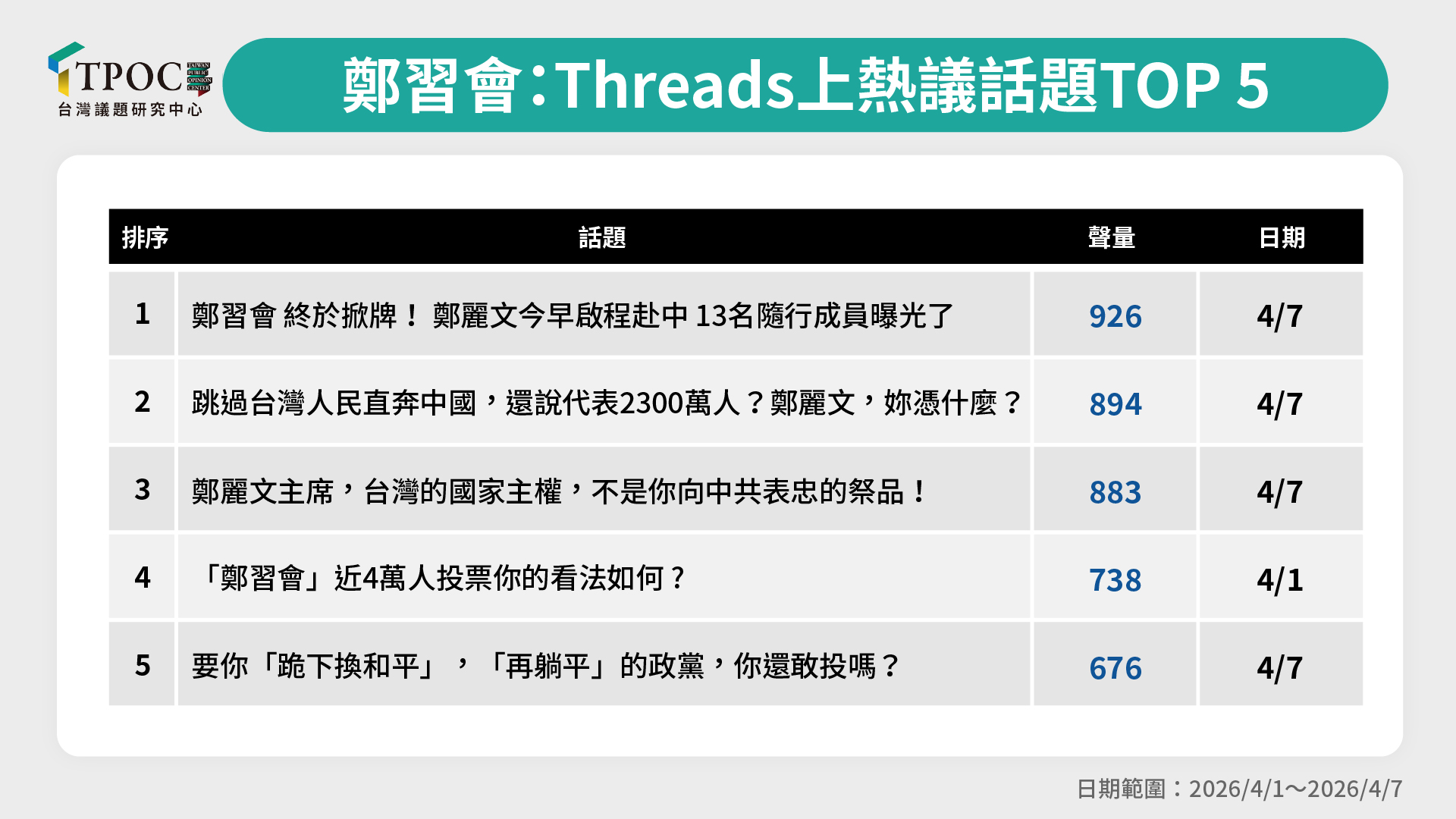 若進一步觀察Threads上的熱門話題,可發現對鄭麗文及國民黨持不友善立場的貼文,往往引發較高討論度。前五名話題中即有三則屬於批判性發文,內容包括質疑鄭麗文無法代表多數台灣民意、批評不應以台灣主權向中國示好,以及反對「以讓步換取和平」的路線。然而從留言區觀察,網友回應呈現反向趨勢,不少留言反駁原貼文立場,如「看到留言都在罵你我就放心了」、「不然你去談,還是你去宣戰」、「就是下架民進黨,管你要洗什麼」等。