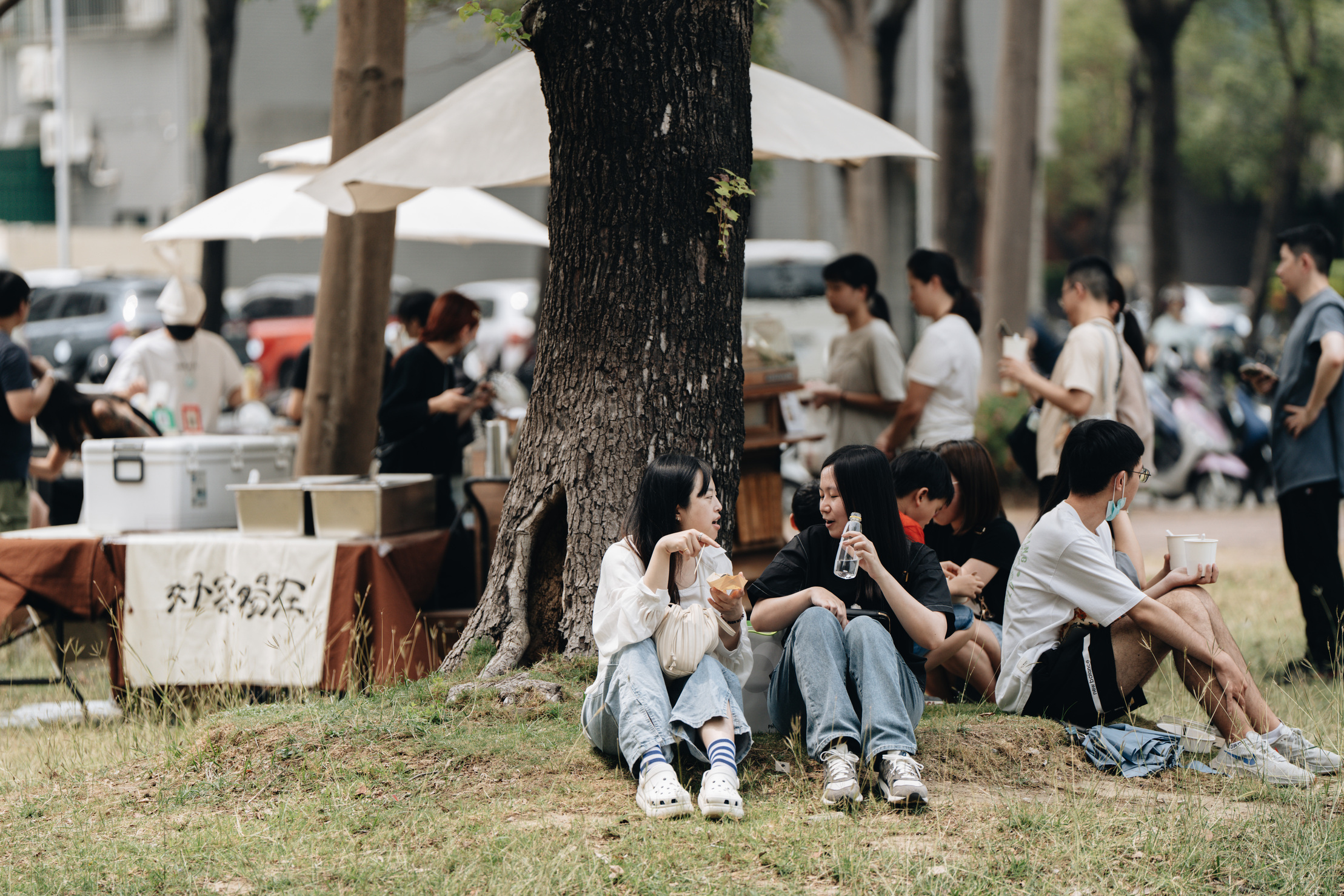圖說:民眾於樹蔭下席地野餐,呈現市集結合生活風格的休閒場景。(圖片來源/台南市文化局提供)