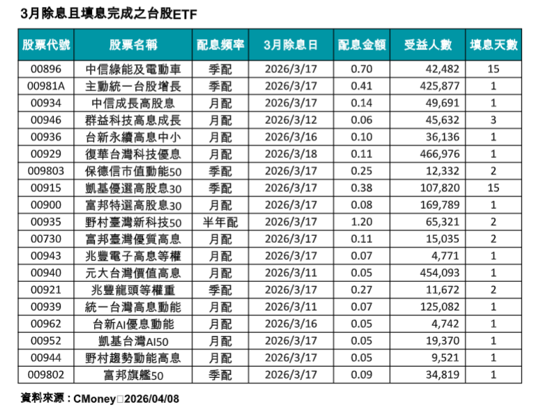 據統計,3月共有27檔台股ETF除息,除息日多落在3月中下旬,其中19檔順利填息,其中16檔更是在2天內順利填息,包括保德信市值動能50 ETF(009803)、主動統一台股增長(00981A)、統一台灣高息動能(00939)、復華台灣科技優息(00929)等。