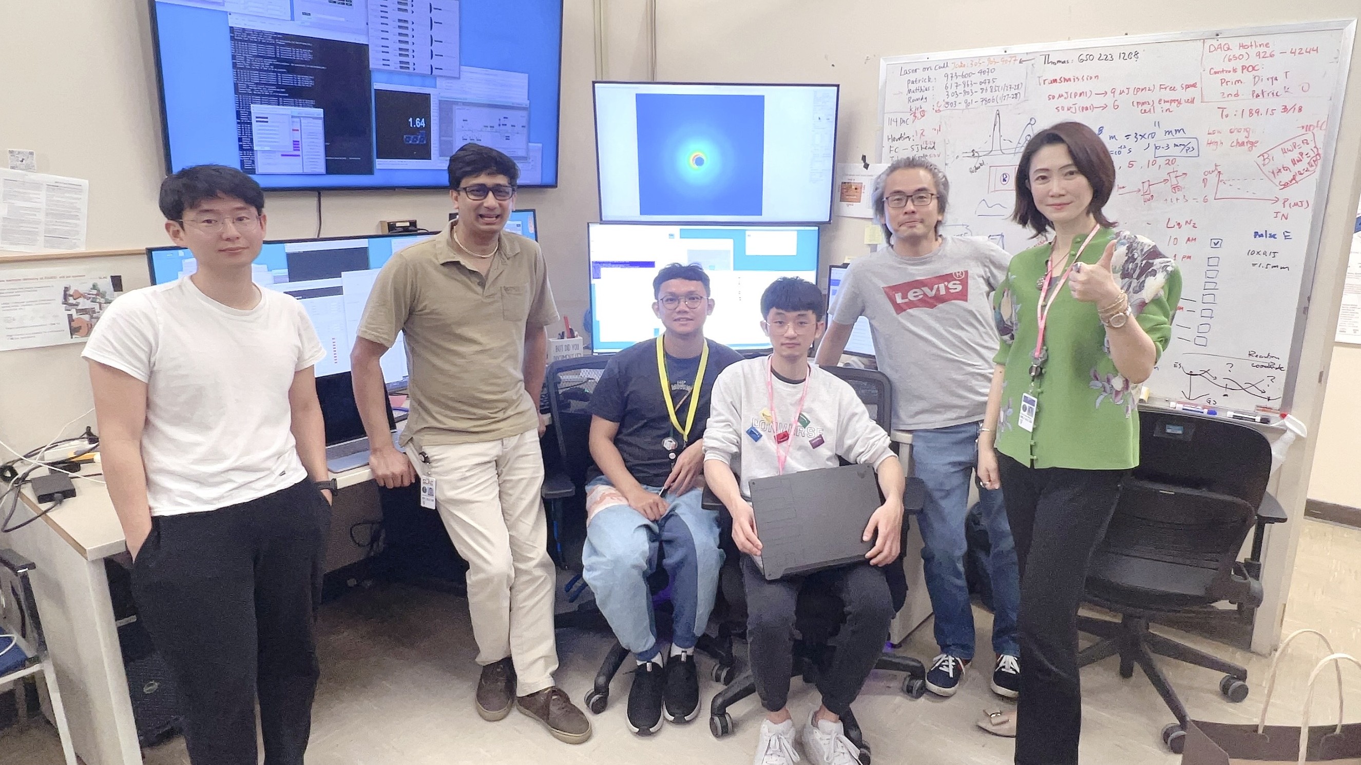 ↑圖說:國立中山大學氣膠科學研究中心由主任王家蓁(右一)率隊,帶領博士後研究員與碩士生前往美國SLAC國家加速器實驗室進行實驗,讓學生在學術初期即接軌全球最前沿科學。右二為SLAC研究員Ming-Fu Lin。(圖片來源:國立中山大學提供)