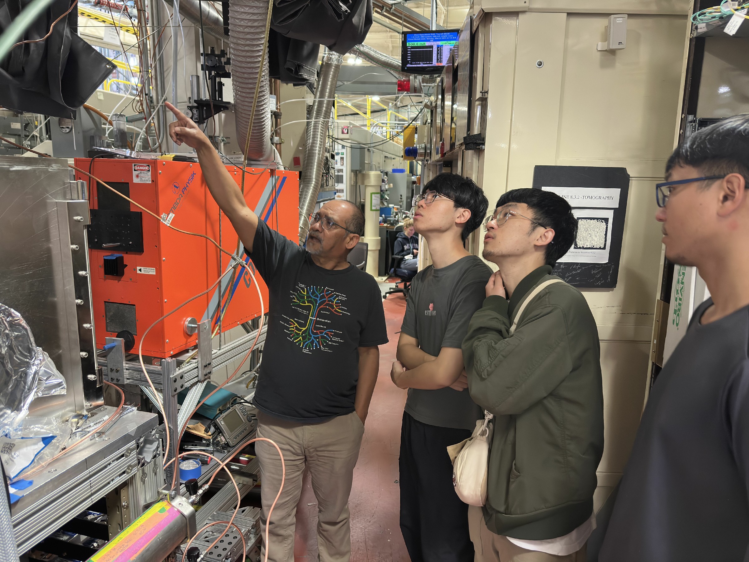↑圖說:研究團隊參訪美國國家級勞倫斯柏克萊國家實驗室,由資深科學家Musa Ahmed(左一)介紹先進光源研究設備。(圖片來源:國立中山大學提供)