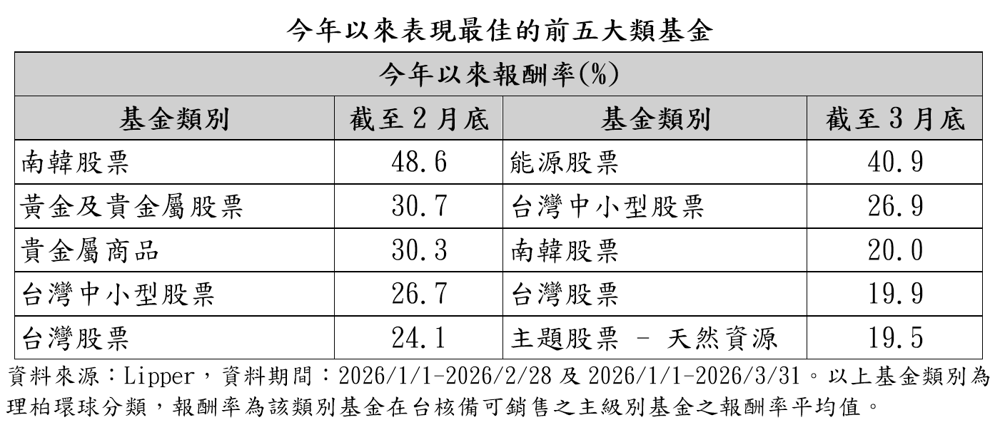 根據理柏環球分類統計,截至3月底,今年以來表現最佳的前五大基金類型依序為能源股票、台灣中小型股票、南韓股票、台灣股票及天然資源股票,報酬率分別為40.9%、26.9%、20%、19.9%及19.5%。