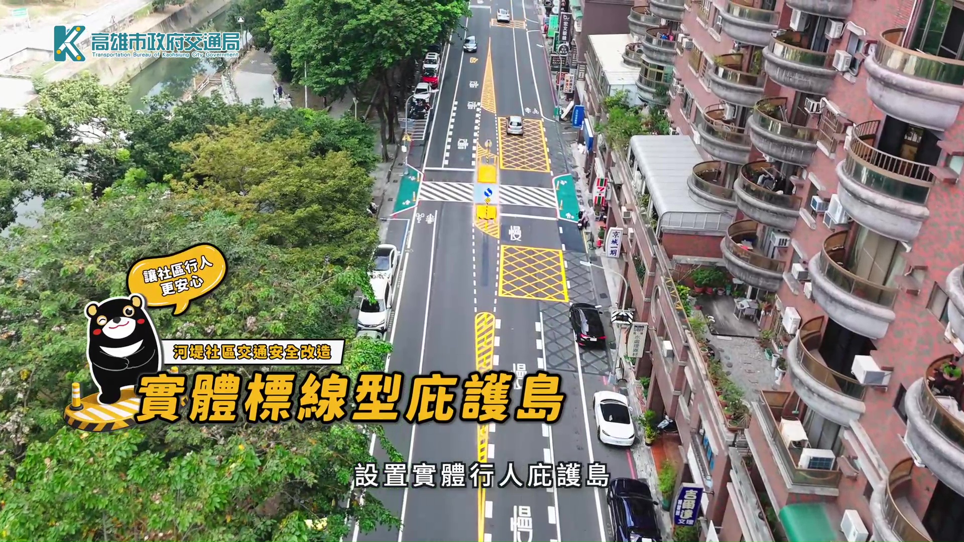 此外,交通局也於三民區河堤路設置全市首座路段中實體行人庇護島,設置於民族一路543巷至裕誠路間約400公尺路段,提供行人安全停等空間,讓民眾可分段穿越道路。庇護島不僅提升穿越安全性,其實體構造亦可在車輛失控時形成防護屏障,降低衝擊風險。