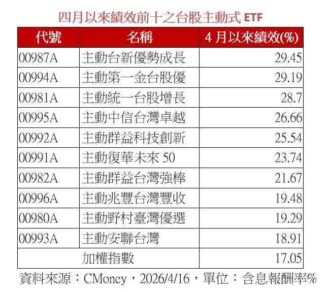 12檔台股主動式ETF也是飆翻天,檢視4月以來績效前10名,報酬率皆超越同期間台股漲幅,其中,台新臺灣優勢成長主動式ETF基金(00987A)、主動第一金台股優(00994A)、主動統一台股增長(00981A)大漲近3成。
