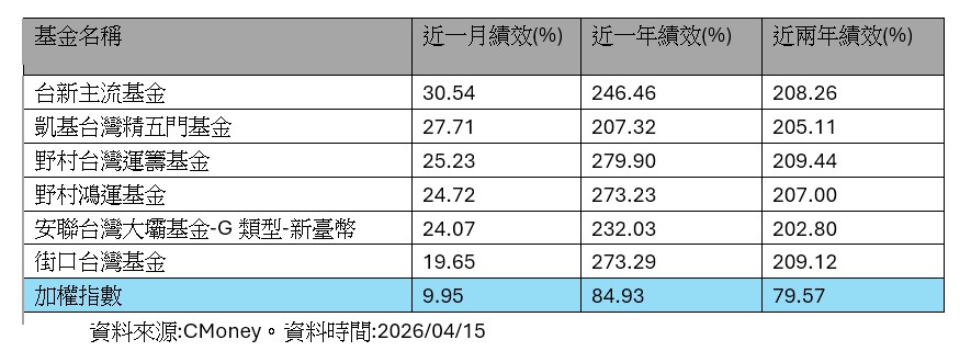 台股強強滾,台股基金績效也是嚇嚇叫,有36檔近1年的含息報酬率超過200%,大幅領先台灣加權指數同期的84.93%。其中有6檔,近一年及近兩年績效皆突破200%。